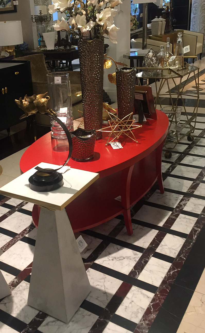 Столик Tribeca от американского бренда Century Furniture изготавливается из твердых пород клена и орехового шпона. В наличии представлен в красном цвете.
