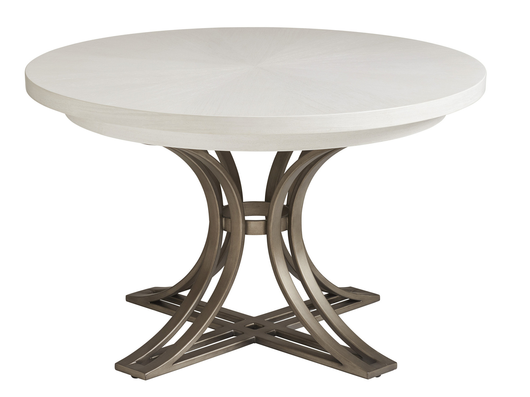 Стол Marsh Creek из коллекции Ocean Breeze от премиального американского бренда Tommy Bahama имеет столешницу из радиально уложенного шпона на металлическом основании с матовым оловянным покрытием. Такой стол можно использовать и как игровой.