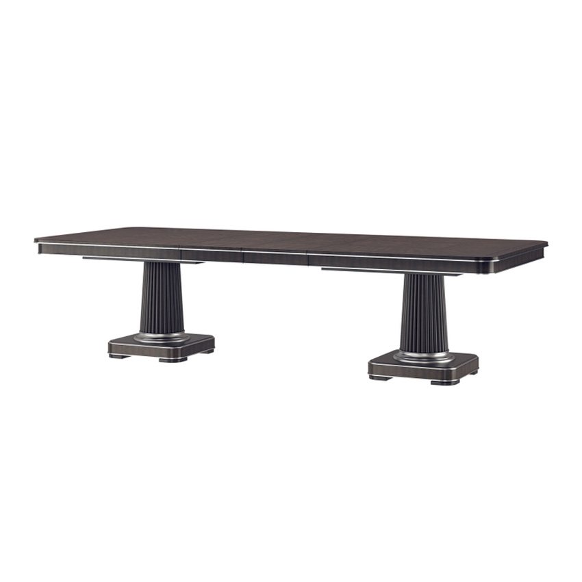 Обеденный стол Spencer London от американского премиального бренда Theodore Alexander изготавливается из массива дерева, шпона и металла. Массивные рифлёные ножки напоминают колонны. Вертикальные рифления добавляют изысканности и визуального интереса.