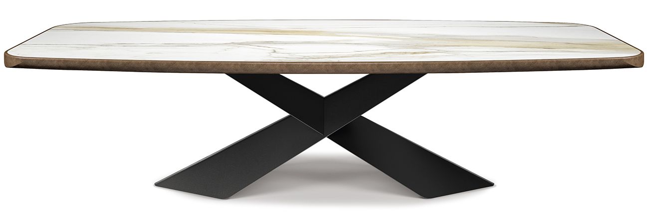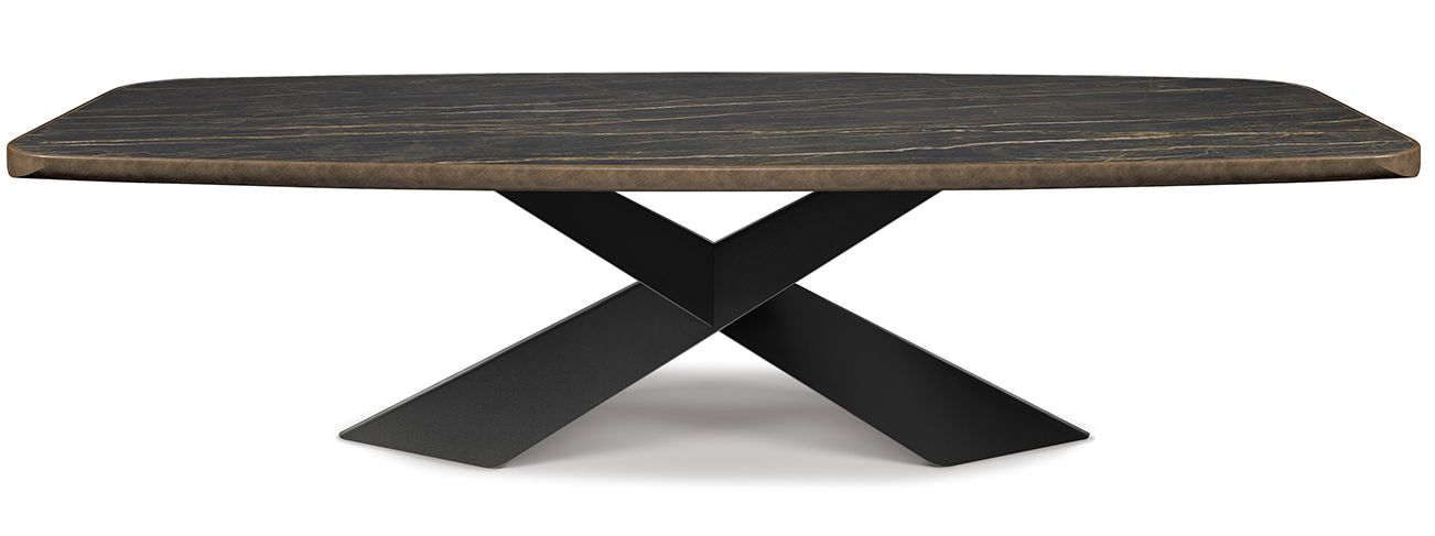 Стол TYRON KERAMIK PREMIUM от премиального итальянского бренда CATTELAN ITALIA. Дизайнер Paolo Cattelan. Стол с базой из стали, окрашенной в титан (GFM11), бронза (GFM18), графитовый (GFM69) или черный (GFM73) цвет. Столешница керамическая цвета Marmi Calacatta (KM01), Alabastro (KM02), Ardesia (KM04), матовый Golden Calacatta (KM05), глянцевый Golden Calacatta (KM06), матовый Portoro (KM07), глянцевый Portoro (KM08), глянцевый Sahara Noir (KM09), Emperador (KM10), Makalu (KM11), Breccia (KM12) или Arenal (KM13) с нижним скругленным профилем из стали шлифованной бронзы, шлифованного серого оттенка. Версия 300x128 см с деревянной столешницей 6 мм, или 5 мм для версии 200x120 и 240x120 см. Предназначен на 8-12 гостей, в зависимости от выбранного размера.