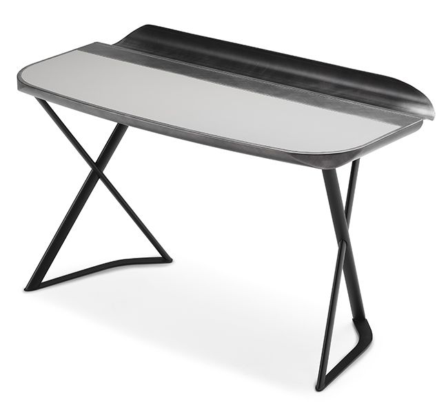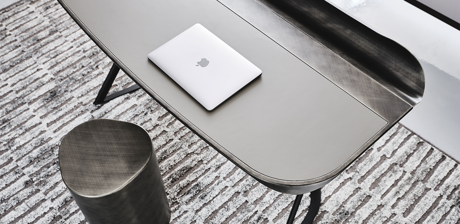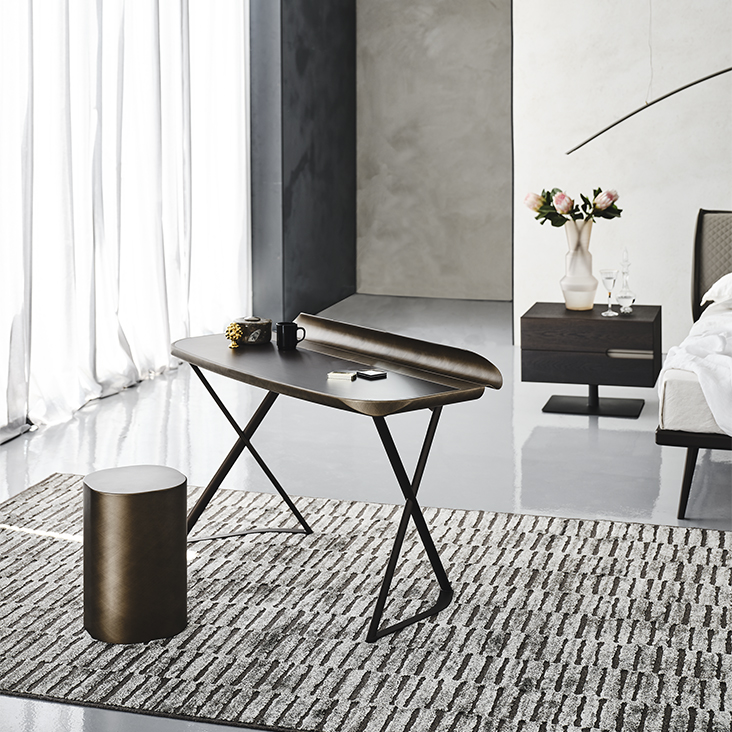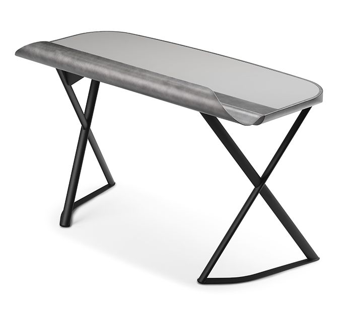 Стол COCOON LEATHER от премиального итальянского бренда CATTELAN ITALIA. Дизайнер Paolo Cattelan. Письменный стол с основанием из стали оттенка титан (GFM11), бронза (GFM18) или черный (GFM73). Столешница с отделкой кожей со шлифованным бронзовым или серым глянцевым округлым нижним профилем и подносом в виде желоба оттенка шлифованной бронзы или серого цвета.