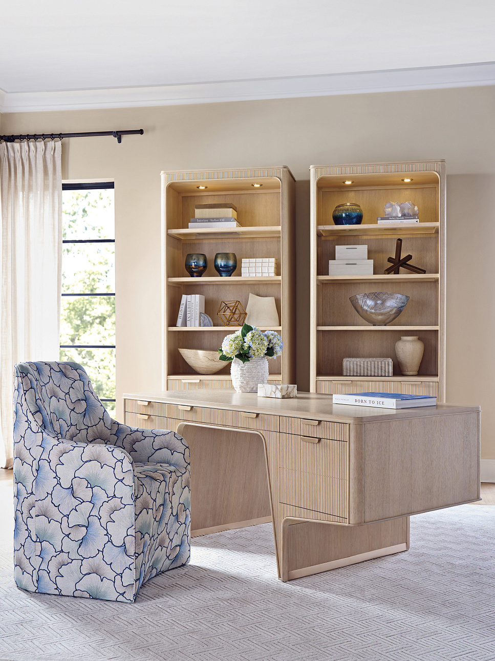 Письменный стол Montreux от американского премиального бренда Lexington. Современный дизайн домашнего кабинета с вертикальными филенками из белого дуба и ценных пород дерева с отделкой под натуральный белый дуб и скругленными углами. Фурнитура выполнена в цвете шампань. Металлические элементы имеют матовую золотистую отделку.
