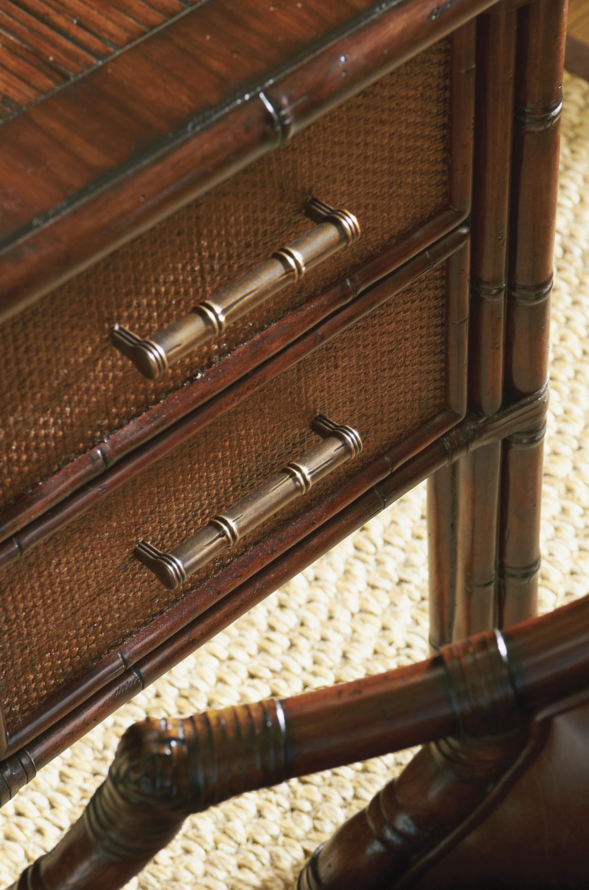 Письменный стол Paradise Isle от американского премиального бренда Lexington. Изысканный шпон палисандра и отделка из ротанга в сочетании с декоративными бамбуковыми панелями и кожаной столешницей придают этому письменному столу утонченный, но в то же время непринужденный вид. Плетеные панели из ротанга и фасады ящиков открывают доступ к одному выдвижному ящику для документов, двум ящикам для хранения и выдвижному ящику для клавиатуры с эргономичной подставкой для рук.