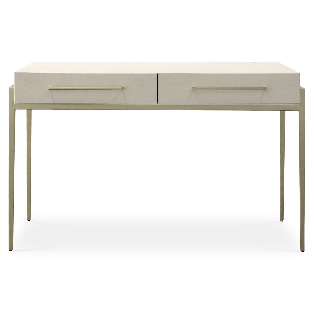Письменный стол Jewel от премиального американского бренда Uttermost оснащён столешницей из искусственной шагрени белого цвета, которая установлена на металлическом основании и ножках с позолотой. Скошенные края выдвижных ящиков и ручки в золотой отделке придают модели лаконичный и изысканный вид.