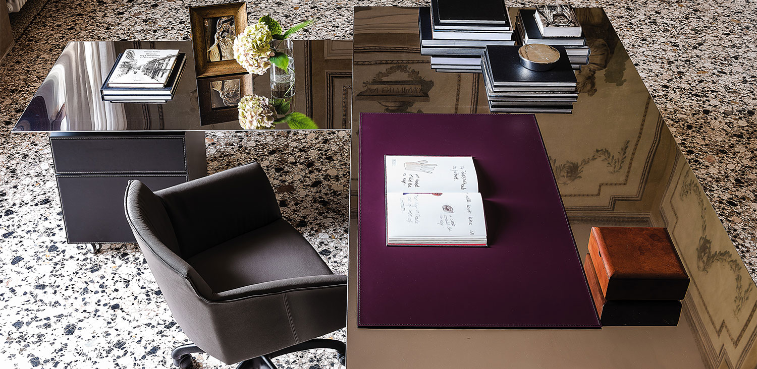 Стол VEGA от премиального итальянского бренда CATTELAN ITALIA. Дизайнер Giorgio Cattelan. Письменный стол из нержавеющей глянцевой стали или покрытый шпоном ореха Canaletto (NC) или обоженного дуба (RB), внутри окрашен в цвет матовый графит (OP69). Возможные аксессуары: дактиль в такой же отделке, что и стол (поддерживается тумбой), тумба на двух колесиках со структурой, окрашенной в графитовый (OP69) цвет и с фасадом в твердой коже цвета согласно образцам, коврик в коже цвета согласно образцам. Небольшие неравномерности на отражающей поверхности стола могут быть результатом ручной обработки элемента. Размер дактиля ш 150 x г 70 x в 66 см.