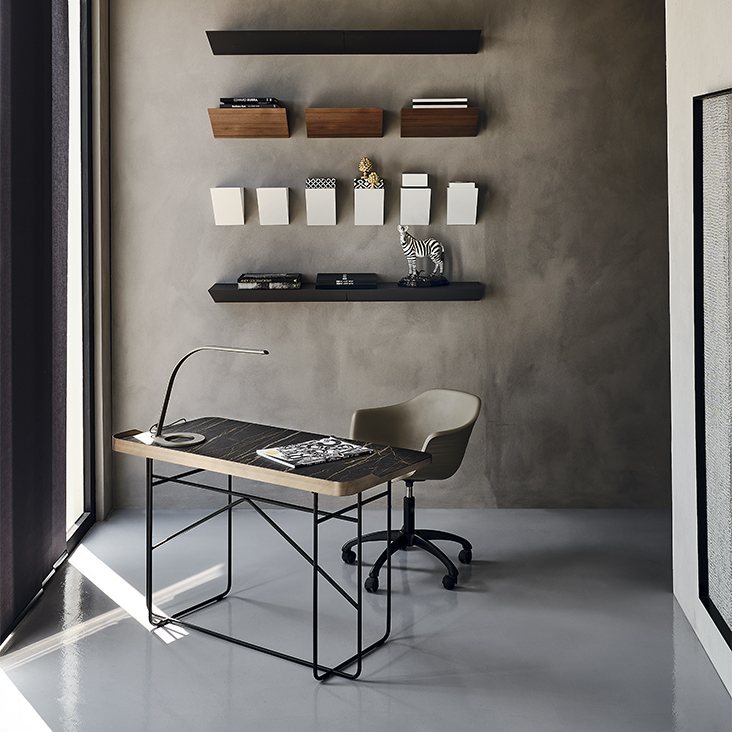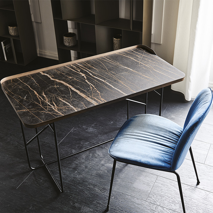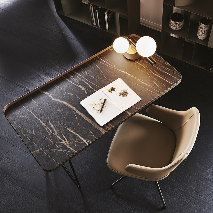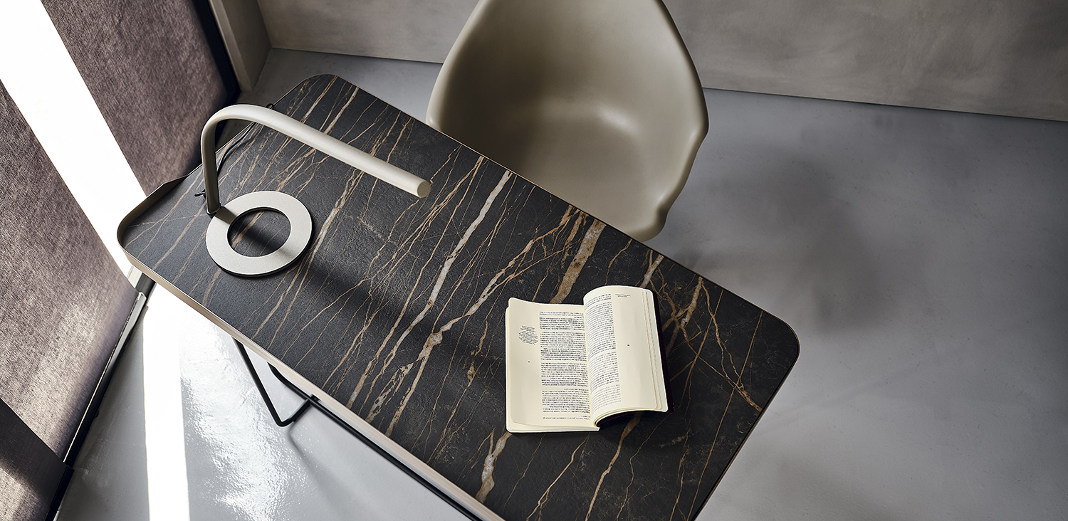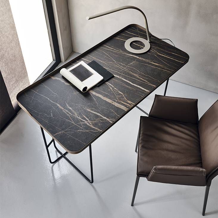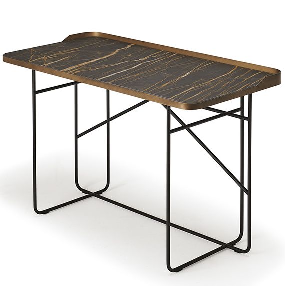 Стол WOLF KERAMIK от премиального итальянского бренда CATTELAN ITALIA. Дизайнер Paolo Cattelan. Письменный стол с базой и рамой топа из стали, окрашенной в гофрированный титан (GFM11) или черный (GFM73), с базой из стали окрашенной в гофрированный черный (GFM73) и рамой топа в брашированной бронзе. Топ из керамики цветов Calacatta (KM01), Alabastro (KM02), Ardesia (KM04), Golden Calacatta opaco (KM05), Golden Calacatta lucido (KM06), Portoro opaco (KM07), Portoro lucido (KM08), Sahara Noir lucido (KM09), Emperador (KM10), Makalu (KM11), Breccia (KM12) или Arenal (KM13).