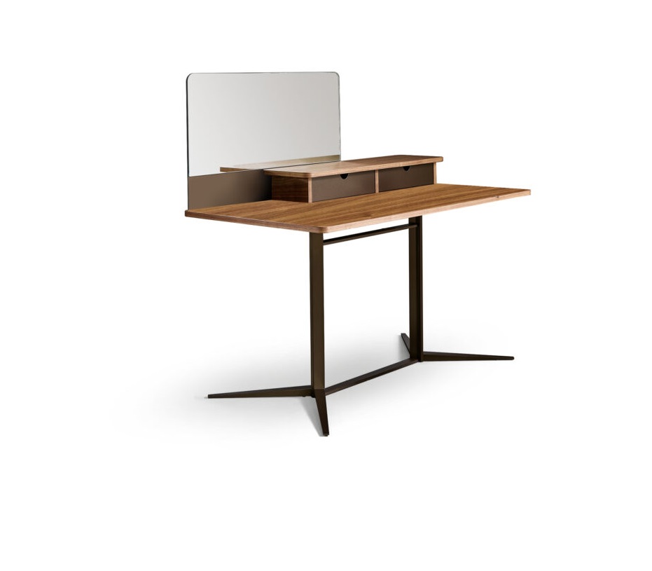 Туалетный столик Nelson от премиального итальянского бренда Bonaldo. Основание выполняется из металла в бронзовой отделке. Столешница изготавливается из шпона орехового дерева. В столе предусмотрены два выдвижных ящика.