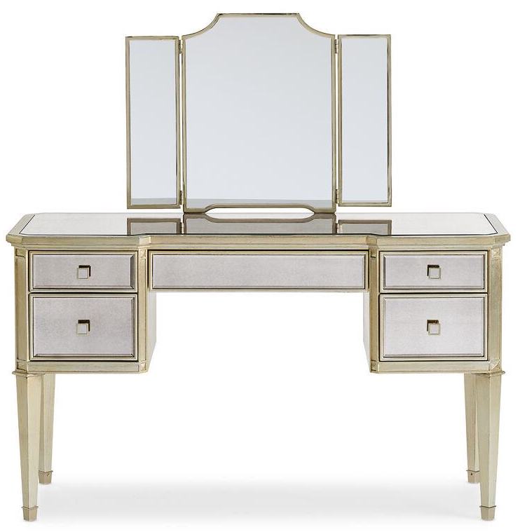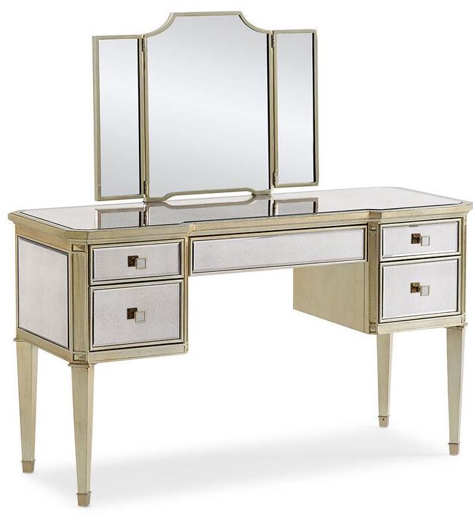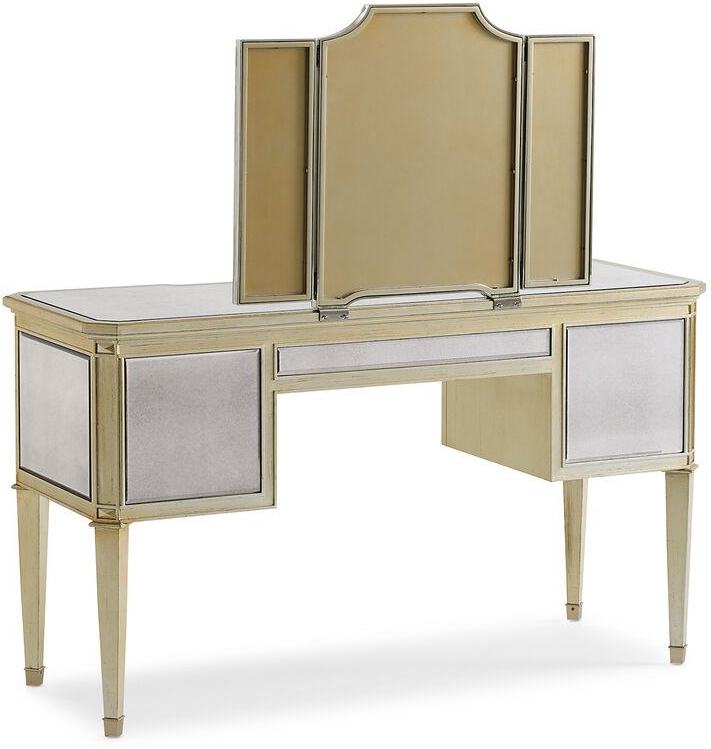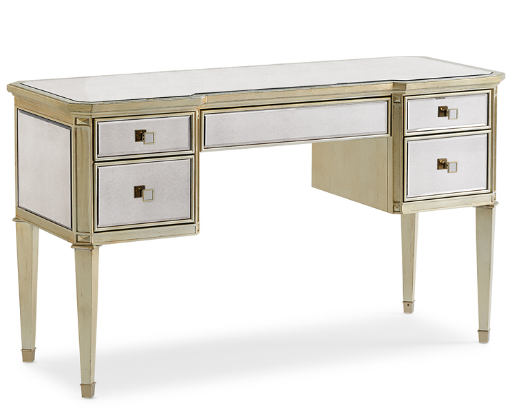 Туалетный столик от американского премиум бренда Caracole. Пять выдвижных ящиков и корпус изделия, украшенные панелями изысканного состаренного зеркала, отражают свет освещают всю комнату. Средний ящик оснащен замком, что превращает его в идеальное место хранения ценных вещей. Конические ножки, фурнитура напоминающая драгоценности и отделка холодного золотистого оттенка (Auric) завершают образ этого сокровища.