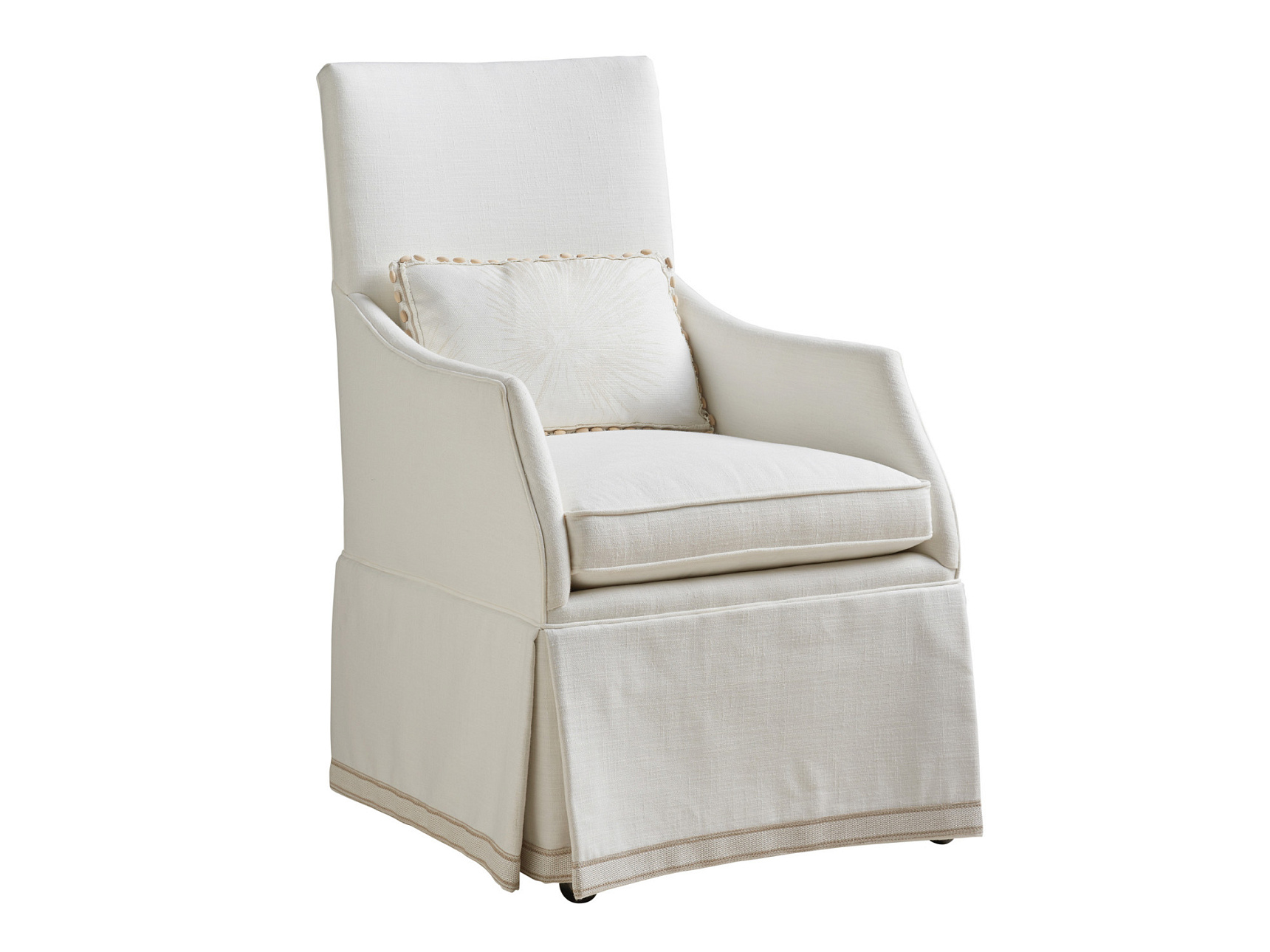 Стул Adelaide из коллекции Upholstery от премиального американского бренда Barclay Butera для Lexington с мягкой обивкой отличается дизайнерским силуэтом, элегантной юбкой «водопад» и декоративной подушкой. Колесики обеспечивают легкость перемещения. Стандартные колесики всех мягких стульев Lexington Home Brands предназначены для использования на ковровых покрытиях, фарфоровых, керамических или каменных поверхностях. Большинство деревянных и виниловых полов имеют более мягкую поверхность, из-за чего колесики могут оставлять следы. Если стулья стоят на деревянном, инженерном или виниловом полу, стандартные колесики следует заменить на колесики, безопасные для деревянных полов.