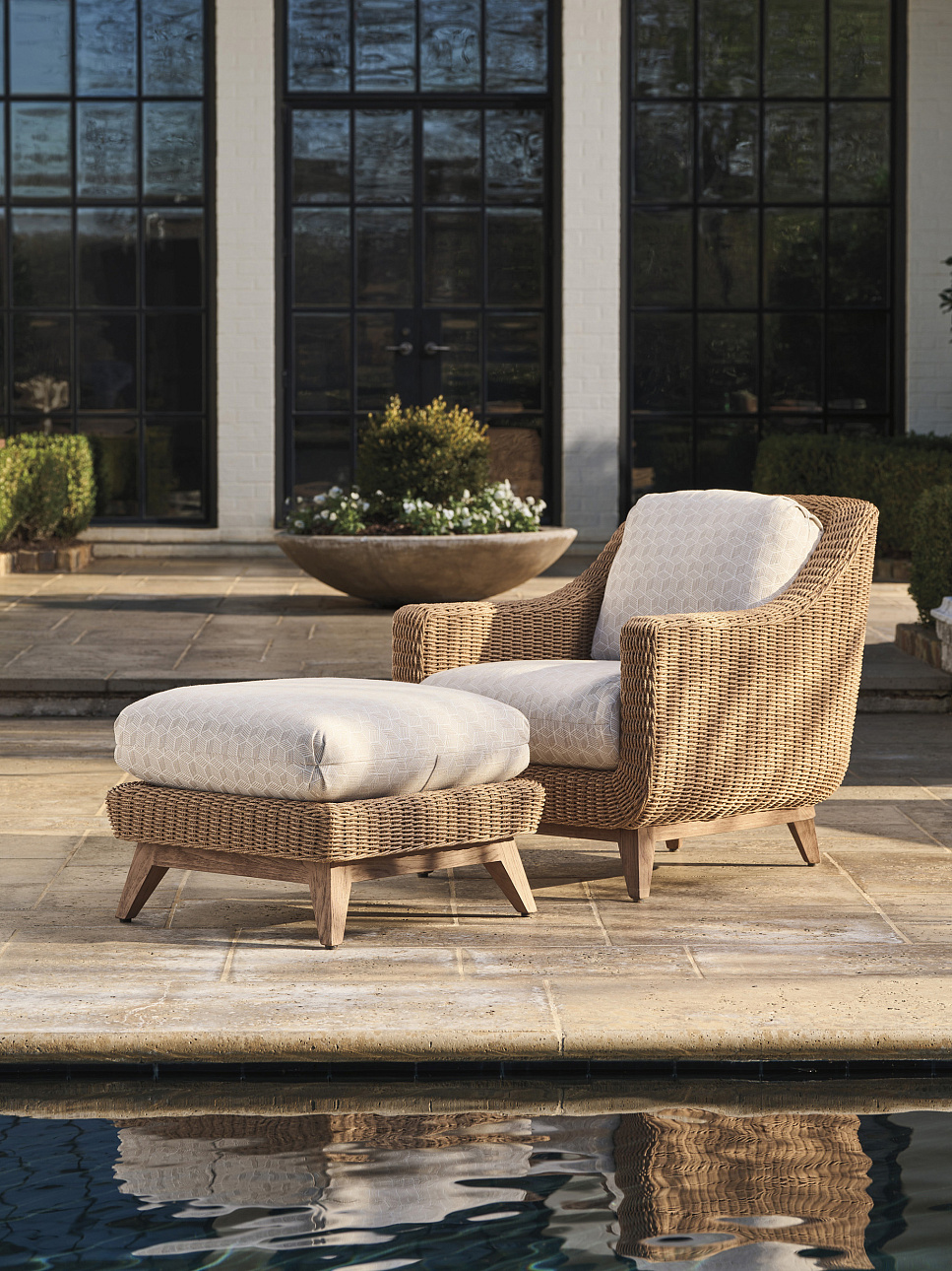 Уличное кресло Isle of Palms из одноименной коллекции от премиального американского бренда Tommy Bahama для Lexington. Кресло с широкой спинкой, плавно переходящей от основания к спинке, отличается исключительным дизайном и комфортом. Его можно дополнить подходящей оттоманкой. Коллекция Isle of Palms сочетает эстетику середины XX века с современными решениями. Плавные линии объединяют тиковое дерево и плетёные детали в цвете мокко. Плетёные рамы добавляют изделиям фактурность и органичный вид. Натуральный тик обработан защитным составом, который сохраняет его первоначальный цвет, а столешницы столиков выполнены из белого агата. Такое сочетание материалов и чистых линий создаёт современный образ для комфортного отдыха на свежем воздухе.