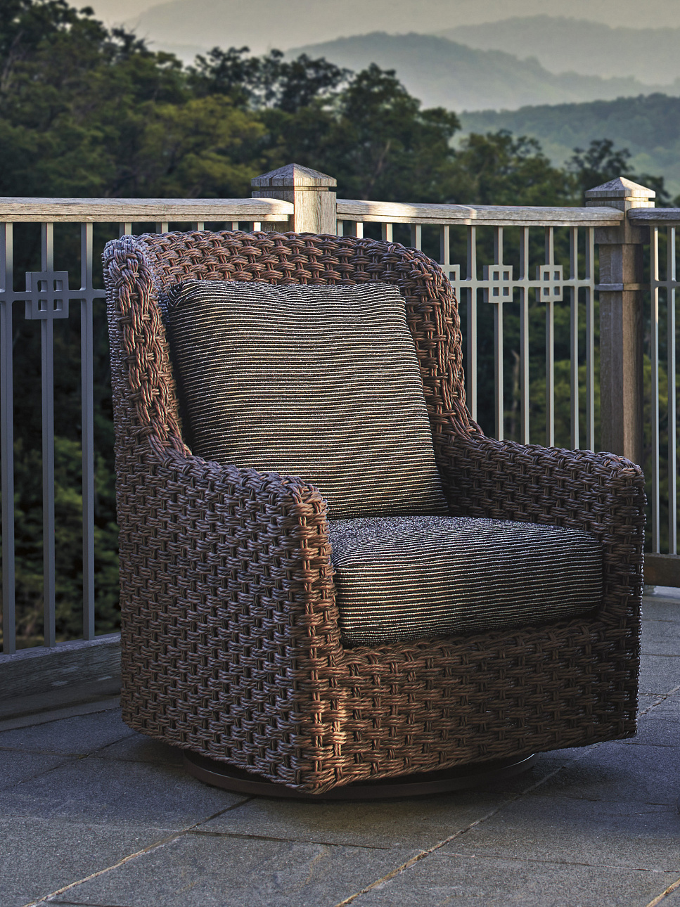 Уличное кресло Kilimanjaro из одноименной коллекции от премиального американского бренда Tommy Bahama для Lexington. Массивная поворотная модель имеет полностью плетеный каркас с глубокой вогнутой спинкой и мягкими подушками сиденья и спинки. Коллекция Kilimanjaro вдохновлена экспедициями в живописные уголки мира и гармонично сочетает оригинальный дизайн, местный колорит, качественные материалы и мастерство исполнения. Изделия выполнены в стиле Tommy Bahama: их украшает устойчивый к погодным условиям плетёный материал насыщенного табачного цвета. Столешницы изготовлены из натурального тика и покрыты защитным лаком — это упрощает уход за поверхностью. Алюминиевые основания с порошковым покрытием цвета эспрессо добавляют коллекции современный акцент.