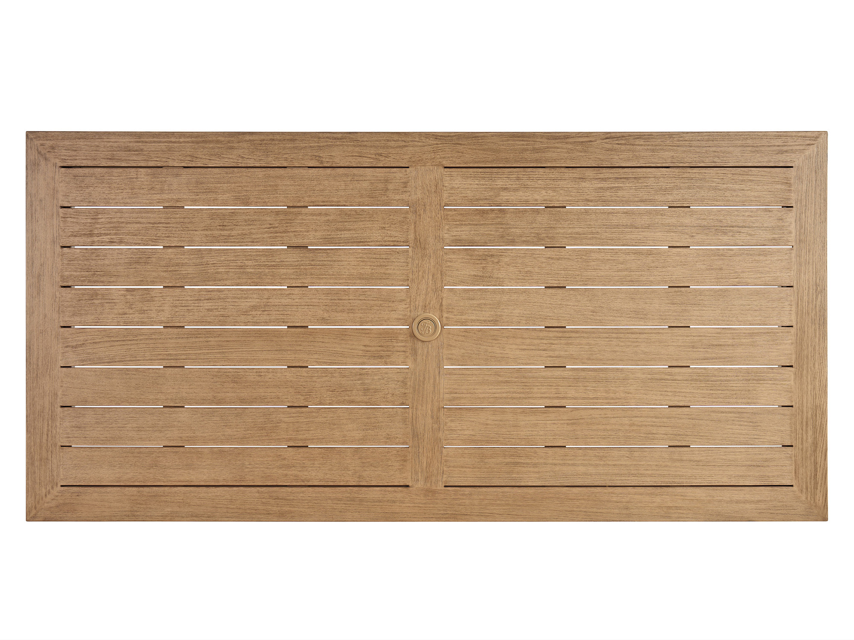 Уличный стол Isle of Palms из одноименной коллекции от премиального американского бренда Tommy Bahama для Lexington. Прямоугольный обеденный стол имеет столешницу из планок со скошенной кромкой по периметру и сквозным отверстием посередине для зонта. В комплект входит декоративная алюминиевая вставка с монограммой TB, которая закрывает отверстие, когда зонтом не пользуются. Коллекция Isle of Palms сочетает эстетику середины XX века с современными решениями. Плавные линии объединяют тиковое дерево и плетёные детали в цвете мокко. Плетёные рамы добавляют изделиям фактурность и органичный вид. Натуральный тик обработан защитным составом, который сохраняет его первоначальный цвет, а столешницы столиков выполнены из белого агата. Такое сочетание материалов и чистых линий создаёт современный образ для комфортного отдыха на свежем воздухе.