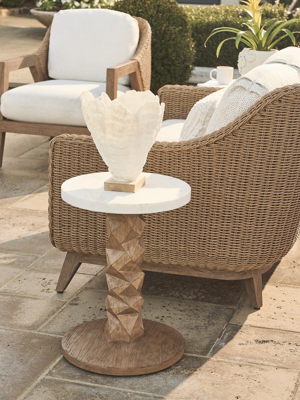 Уличный столик Isle of Palms из одноименной коллекции от премиального американского бренда Tommy Bahama для Lexington. Акцентный стол с современным основанием в виде граненого столба и столешницей из белого агата с защитным покрытием. Коллекция Isle of Palms сочетает эстетику середины XX века с современными решениями. Плавные линии объединяют тиковое дерево и плетёные детали в цвете мокко. Плетёные рамы добавляют изделиям фактурность и органичный вид. Натуральный тик обработан защитным составом, который сохраняет его первоначальный цвет, а столешницы столиков выполнены из белого агата. Такое сочетание материалов и чистых линий создаёт современный образ для комфортного отдыха на свежем воздухе.