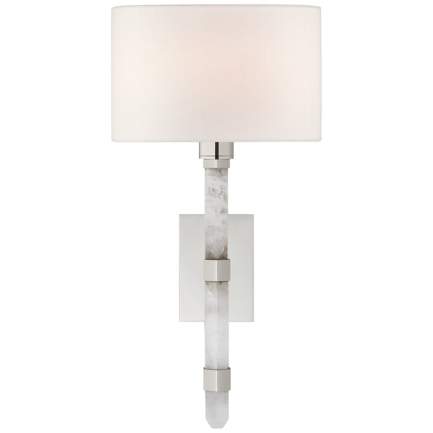 Бра Adaline от премиального американского бренда Visual Comfort. Дизайнер Suzanne Kasler. Основание и элементы корпуса выполнены из стали, окрашенной в цвет полированного никеля. Корпус декорирован длинным стержнем из натурального кварца. Абажур выполнен из натурального льна. Работает от лампочки максимальной мощностью 40 Ватт, E12. Размер крепления 6 х 10 см Размер абажура 19 х 19 х 12 см