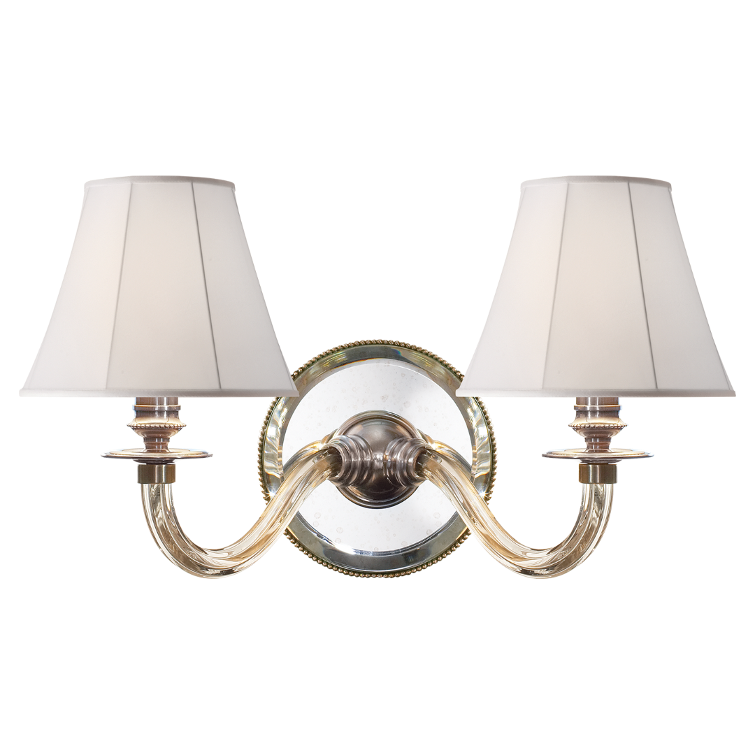 Бра Aymeline от премиального американского бренда Ralph Lauren. Основание выполняется из металла в отделке состаренное посеребрение и в отделке состаренное зеркало. Абажуры выполняются из натурального шелка. Светильник работает от 2 лампочек максимальной мощностью 60 Вт. Абажур: 10.2 х 17.8 х 14 см