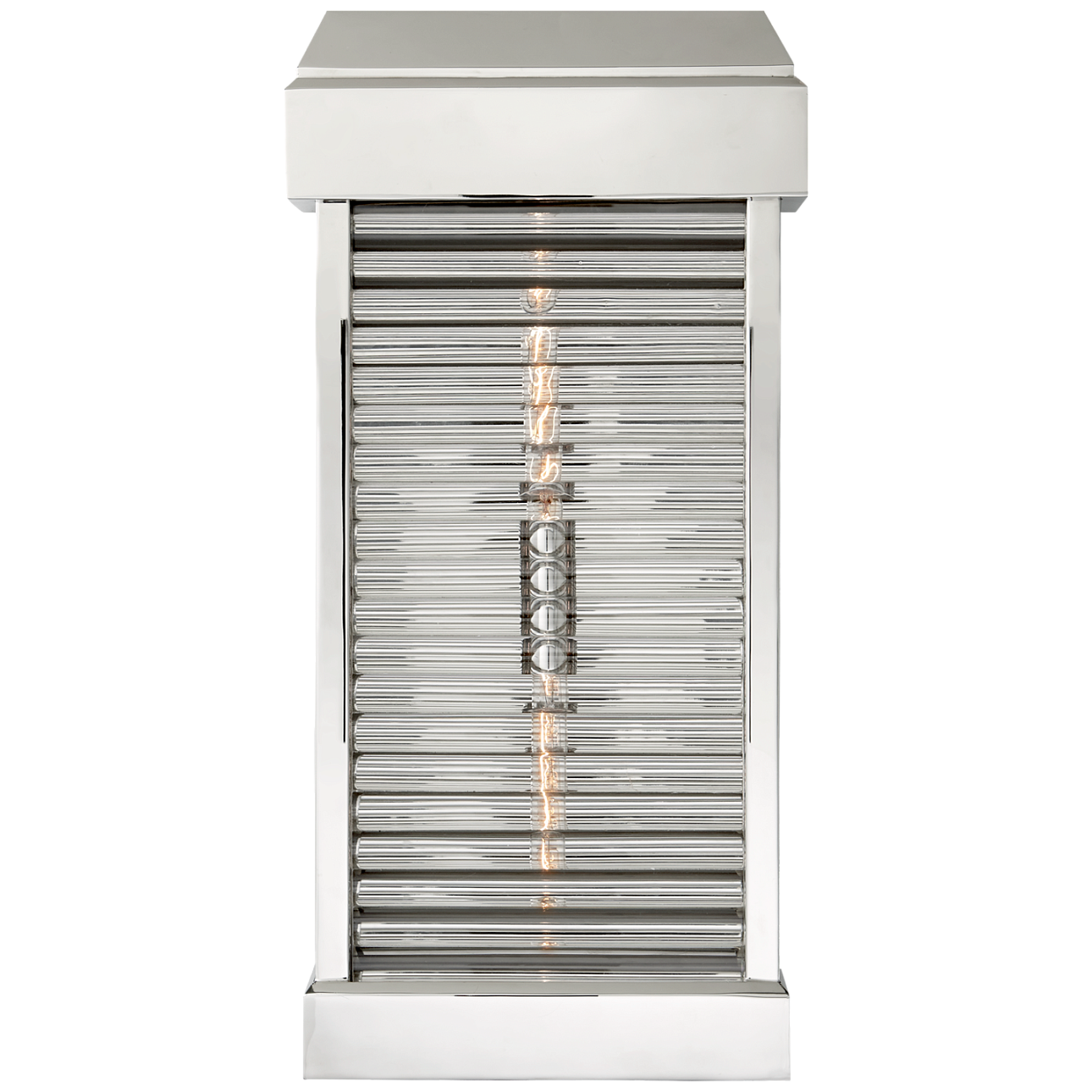Бра Dunmore от премиального американского бренда Visual Comfort. Стальной корпус окрашен в цвет полированного никеля. Диффузор из прозрачного стекла с ребристой поверхностью. Работает от 2 лампочек максимальной мощностью 40 Ватт, E17.