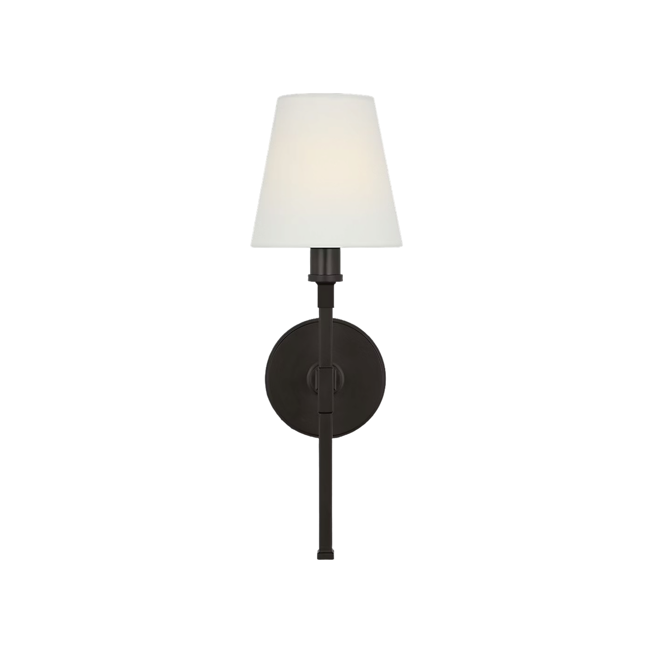 Настенная лампа Perth от премиального американского бренда Generation Lighting изготавливается из металла в отделке состаренное железо. Абажур выполняется из льна белого цвета. Светильник работает от лампочки максимальной мощностью 60 Вт. Основание: 10 см.