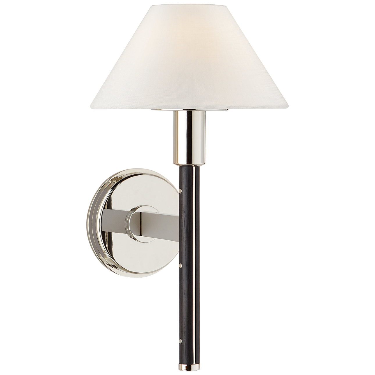 Бра Radford от премиального американского бренда Ralph Lauren Home. Корпус выполнен из стали цвета полированного никеля. Дополнен длинным стержнем из черного дерева. Абажур выполнен из льна. Бра работает от лампочки максимальной мощностью 25 Ватт. Размер крепления к стене 11 см Размер абажура 8 х 20 х 12 см