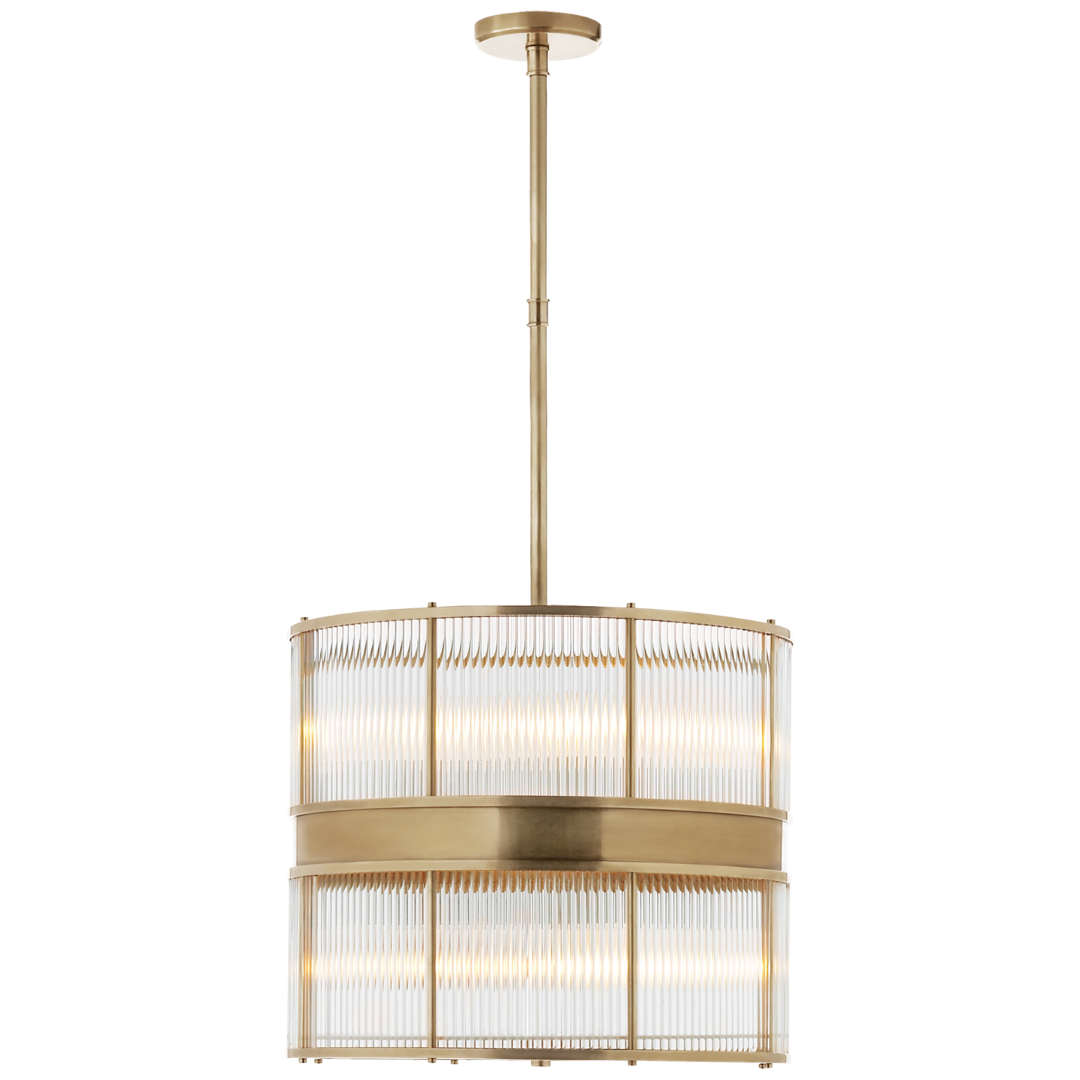 Люстра Allen от премиального американского бренда Ralph Lauren Home. Корпус выполнен из стали цвета латуни или полированного никеля. Дополнен прозрачными стеклянными стержнями, закрепленными по окружности. Удерживается подвесом, состоящим из двух частей по 43 и 41 см. Работает от 8 лампочек максимальной мощностью 40 Вт.