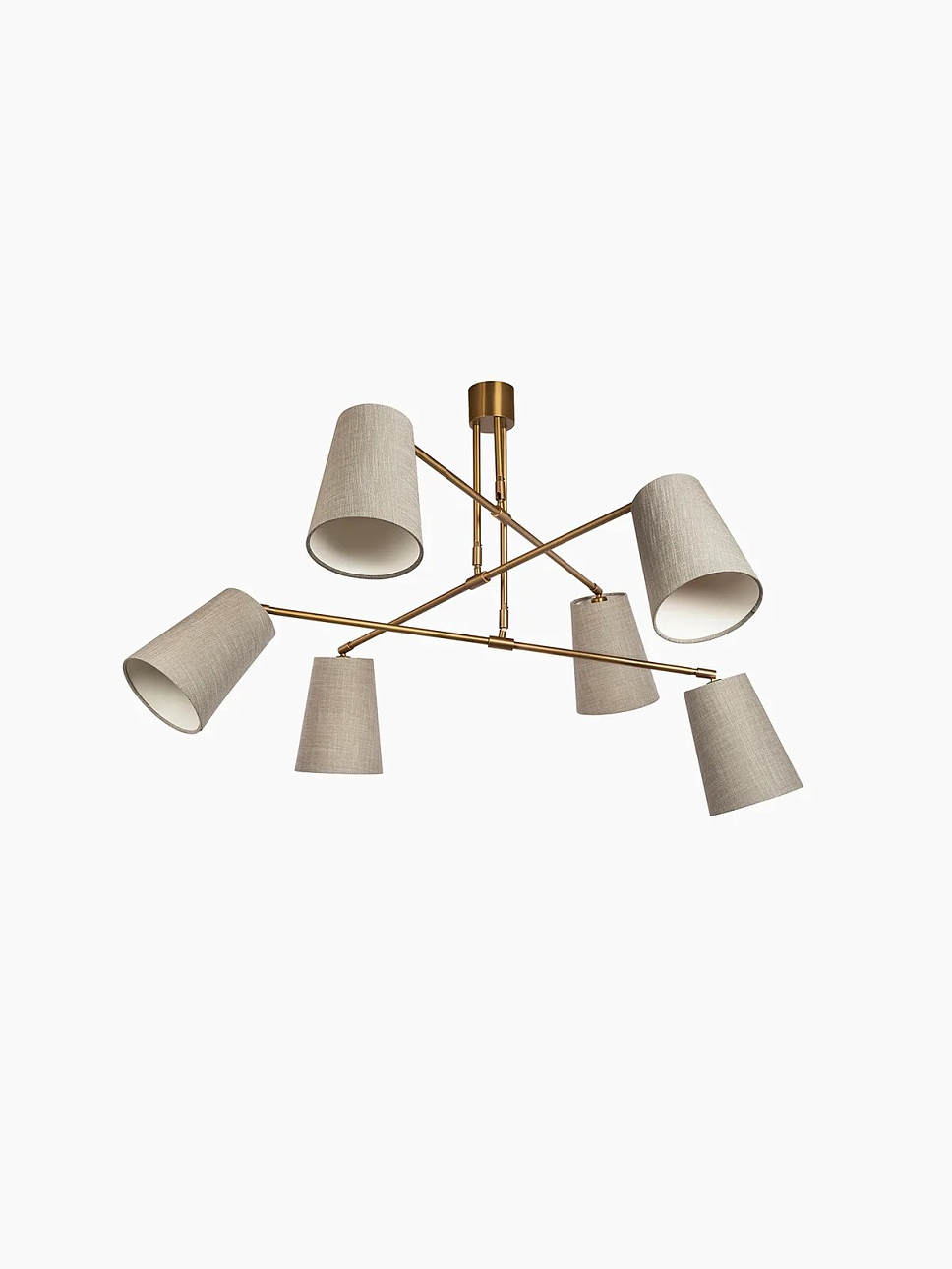 Люстра Andromeda от премиального английского бренда Heathfield & Co изготавливается из металла в латунной отделке. Абажуры выполняются из льна. Светильник работает от 6 лампочек максимальной мощностью 60 Вт, Е14.