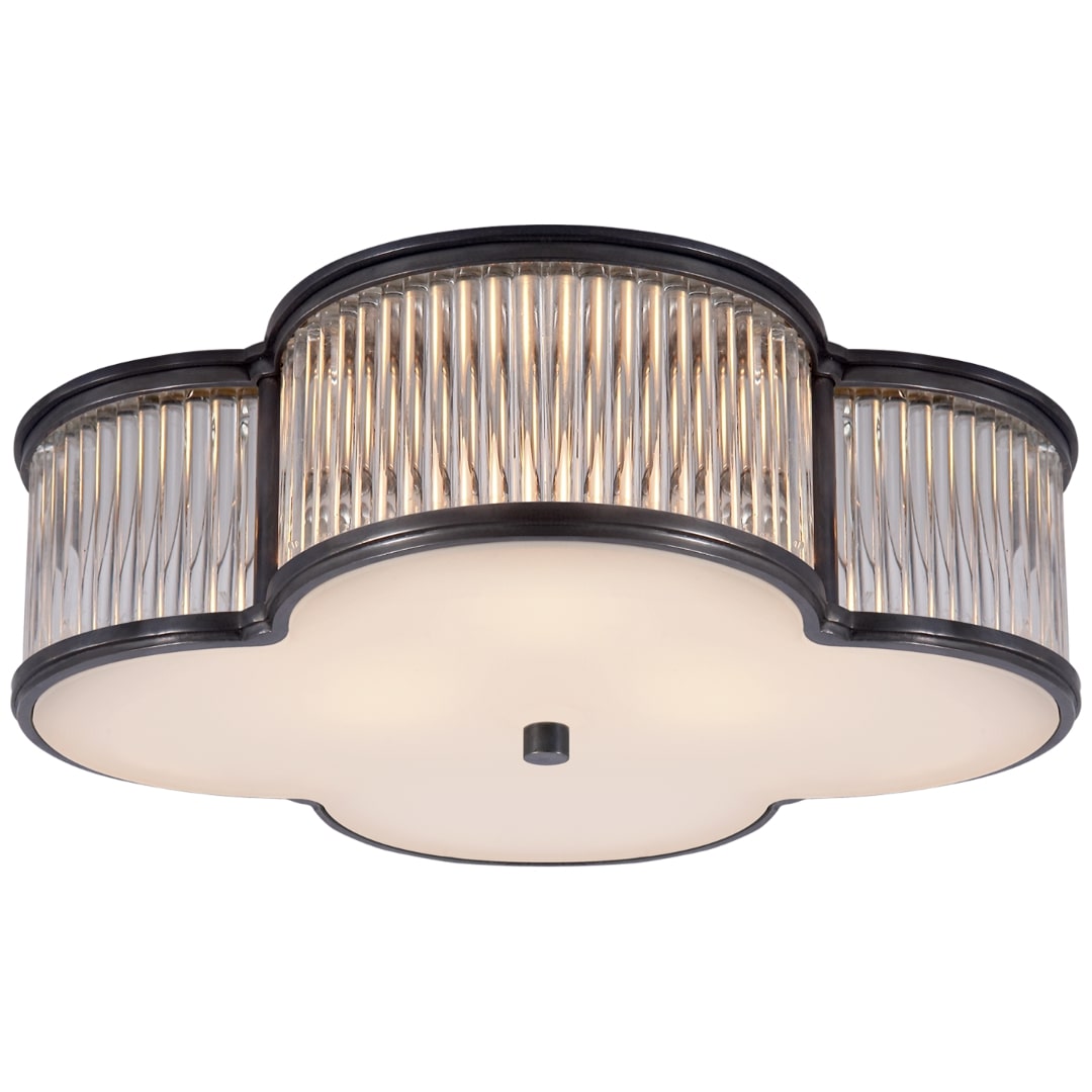 Потолочный светильник Basil от премиального американского бренда Visual Comfort. Основание выполняется из стеклянных трубок и металла, который покрывается лаком в цвете черная эмаль. Диффузор выполнен из матового стекла. Работает от 3 лампочек максимальной мощностью 60 Вт.
