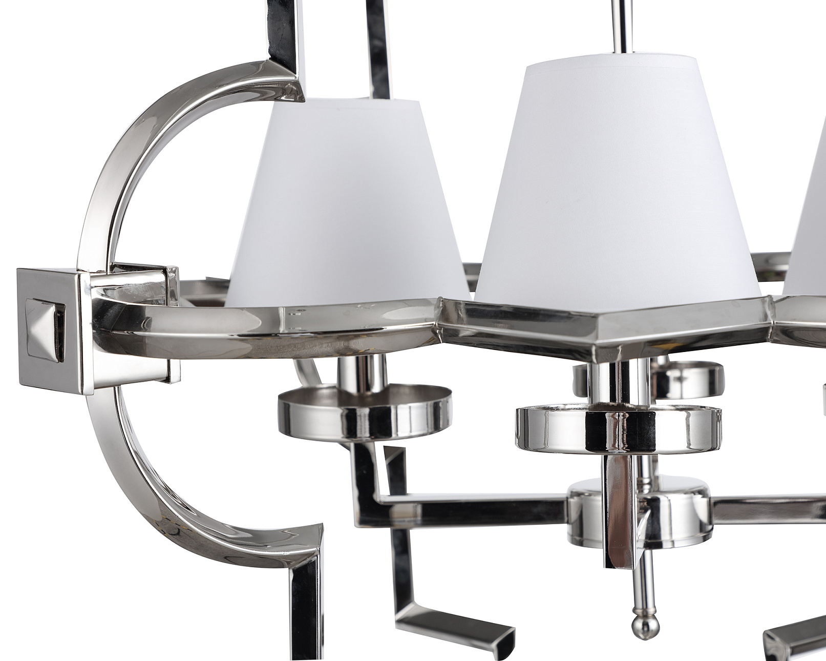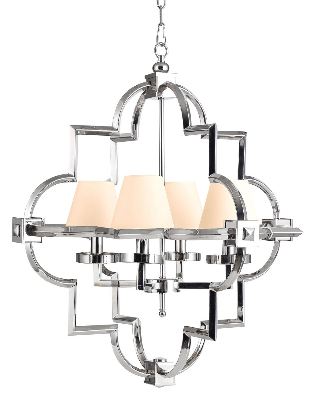 Люстра CARTOUCHE от премиального английского бренда LIANG AND EIMIL. Корпус цвета никель. Удерживается цепью длиной 100 сантиметров. Абажуры белые. Работает от 4 лампочек с цоколем E14, максимальной мощностью 40 Ватт. Лампочки в комплект поставки не входят.