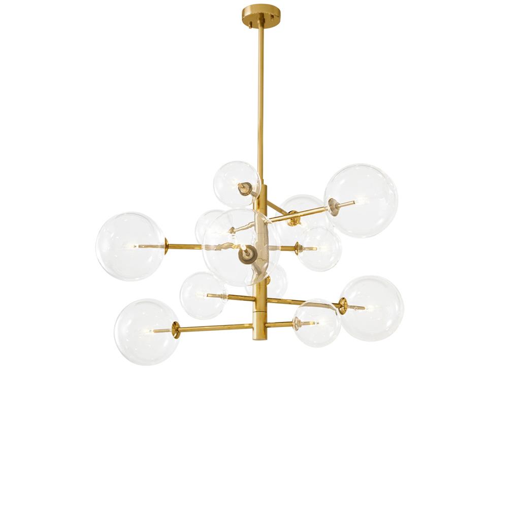 Подвесной светильник Chandelier Argento S от известного бренда Eichholtz. На металлических стержнях цвета латуни установлены прозрачные стеклянные плафоны.