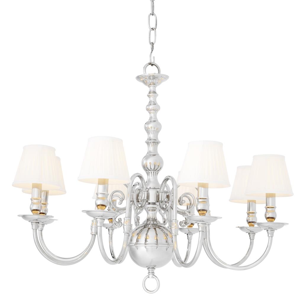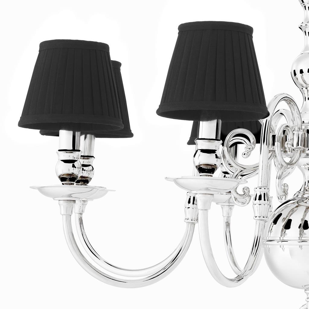 Люстра Chandelier Bourbon от известного бренда Eichholtz. Металлический каркас цвета никеля с установленными на него лампами с абажурами. В комплекте абажуры двух цветов: белого и черного.