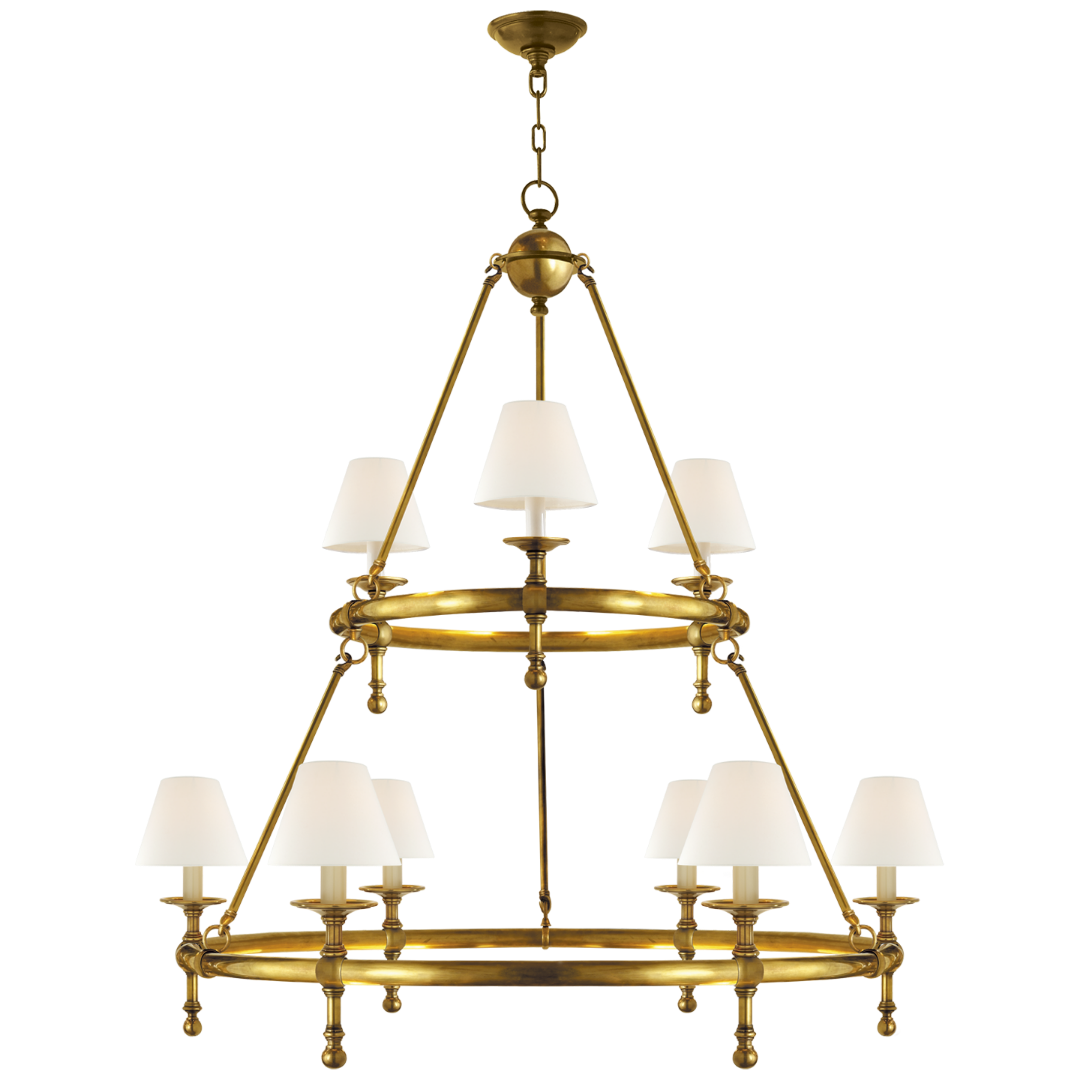 Люстра Classic от премиального американского бренда Visual Comfort. Стальной двухуровневый корпус цвета античной латуни представлен двумя кольцами разного диаметра, соединенных между собой подвесами. Работает от 9 лампочек максимальной мощностью 60 Ватт. Размер крепления к пололку 14 см. Размер абажура 8 х 15 х 13 см.