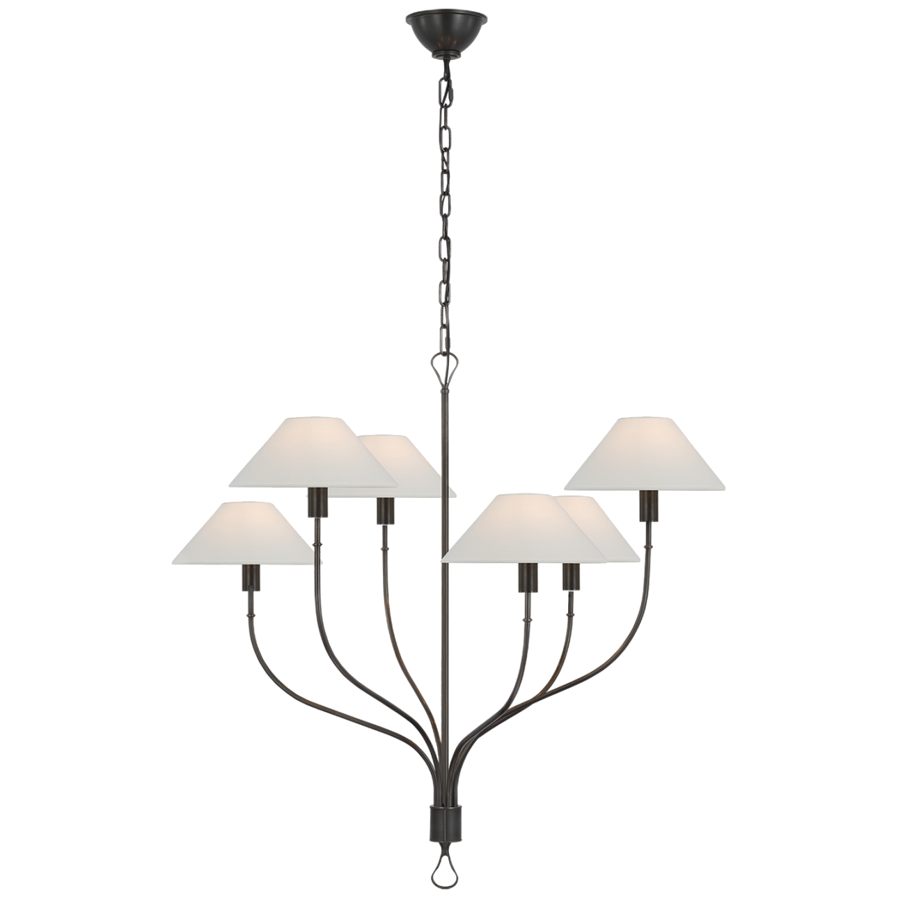 Люстра Griffin от премиального американского бренда Visual Comfort. Корпус выполнен из кожи и металла, окрашенного в бронзовый цвет. Абажуры сделаны из льна. Работает от 6 лампочек максимальной мощностью 60 Вт. Размер крепления 14 см.