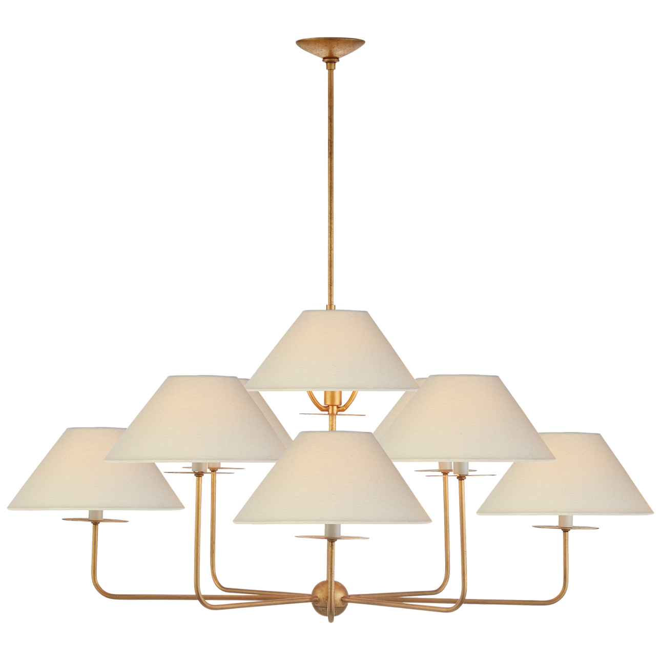 Люстра Kelley от премиального американского бренда Visual Comfort. Корпус выполнен из металла с декоративным покрытием «позолоченное железо». Абажуры сделаны из льна. Работает от 9 лампочек максимальной мощностью 40 Вт. Размер крепления 13 см.