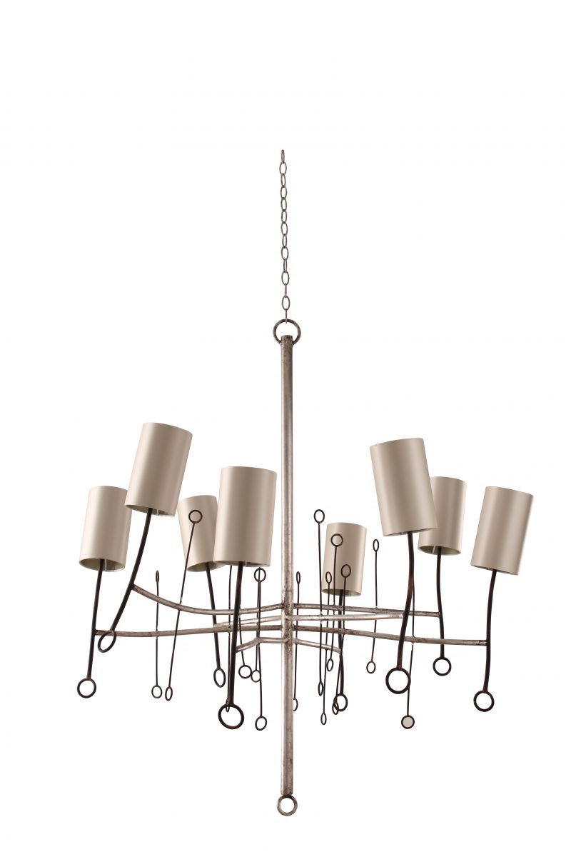 Потолочный светильник LARGE LOLLIPOP CHANDELIER от премиального Английского бренда Porta Romana. Изготовлена из кованой стали с декоративной отделкой. Люстра состоит из восьми цилиндрических плафонов и украшена металлическими прутьями и кружками. К потолку крепится цепью.