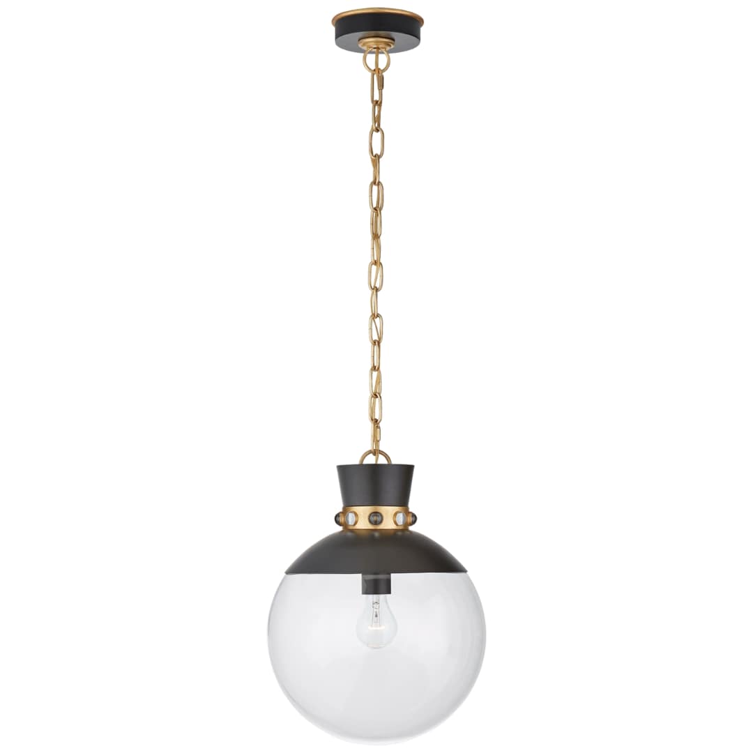 Подвесной светильник Lucia от премиального американского бренда Visual Comfort. Металлическое основание черного цвета, опоясывает украшение окрашенное золотым цветом со стеклянными бусинами. Плафон выполнен из прозрачного стекла. Работает от лампочки мощностью 60 Вт. Крепление: 12.7 см.