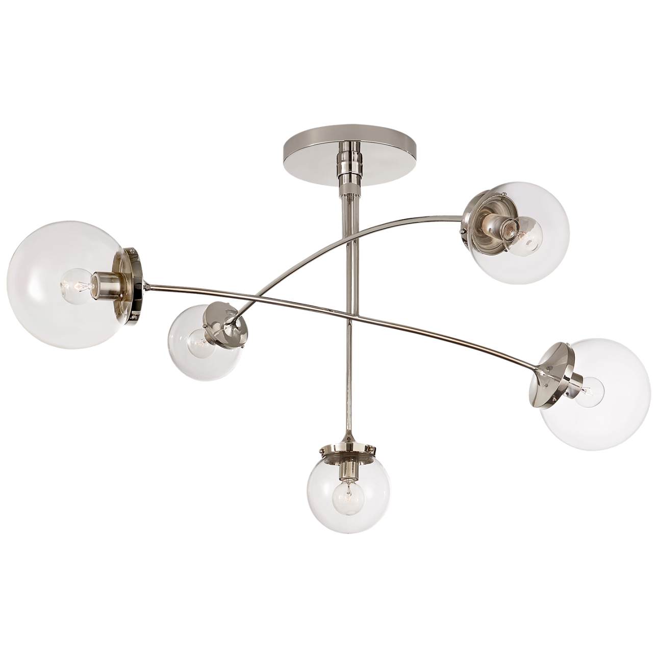 Люстра Prescott от премиального американского бренда Visual Comfort. Стальное основание покрывается лаком в цвете полированный никель. Шарообразные абажуры выполнены из прозрачного стекла. Светильник работает от 5 лампочек максимальной мощностью 40 Вт.