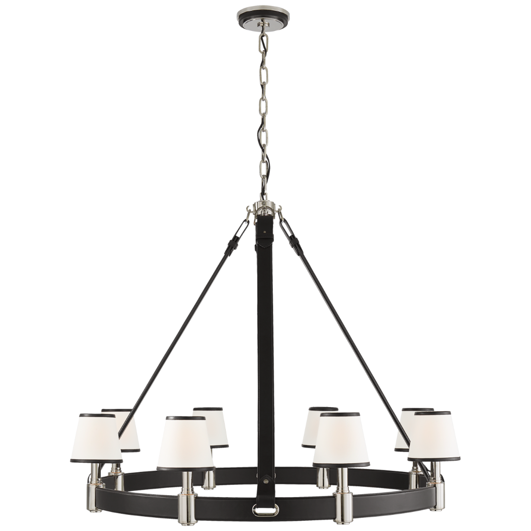 Люстра Riley от премиального американского бренда Ralph Lauren. Корпус круглой формы оформлен кожей и металлическими элементами цвета полированного никеля. Закреплен с помощью трех ремней к потолочному подвесу в виде цепи. Абажуры выполнены из льна с кожаной окантовкой. Работает от 8 лампочек максимальной мощностью 40 Ватт. Размер крепления 17 см Размер абажура 10 х 15 х 15 см