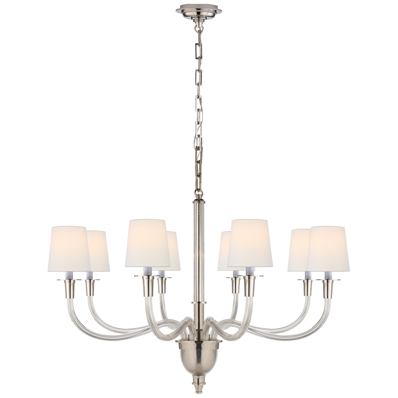Люстра Vivian от премиального американского бренда Visual Comfort изготавливается из металла в отделке полированный никель. Абажуры выполняются из льна. Светильник работает от 8 лампочек максимальной мощностью 60 Вт.
