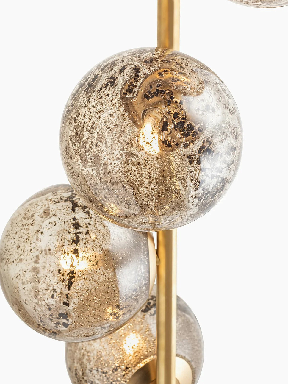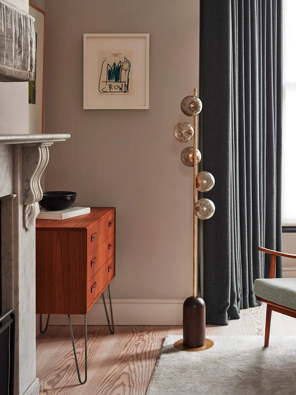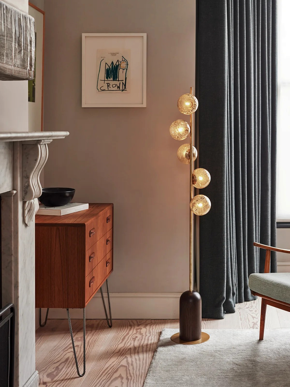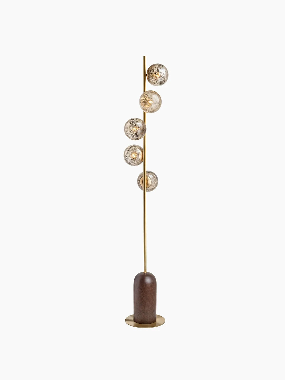 Напольная лампа Carter от премиального английского бренда Heathfield & Co изготавливается из металла в латунной отделке и дуба. Абажуры выполняются из стекла. Светильник работает от 5 лампочек максимальной мощностью 60 Вт, G9.