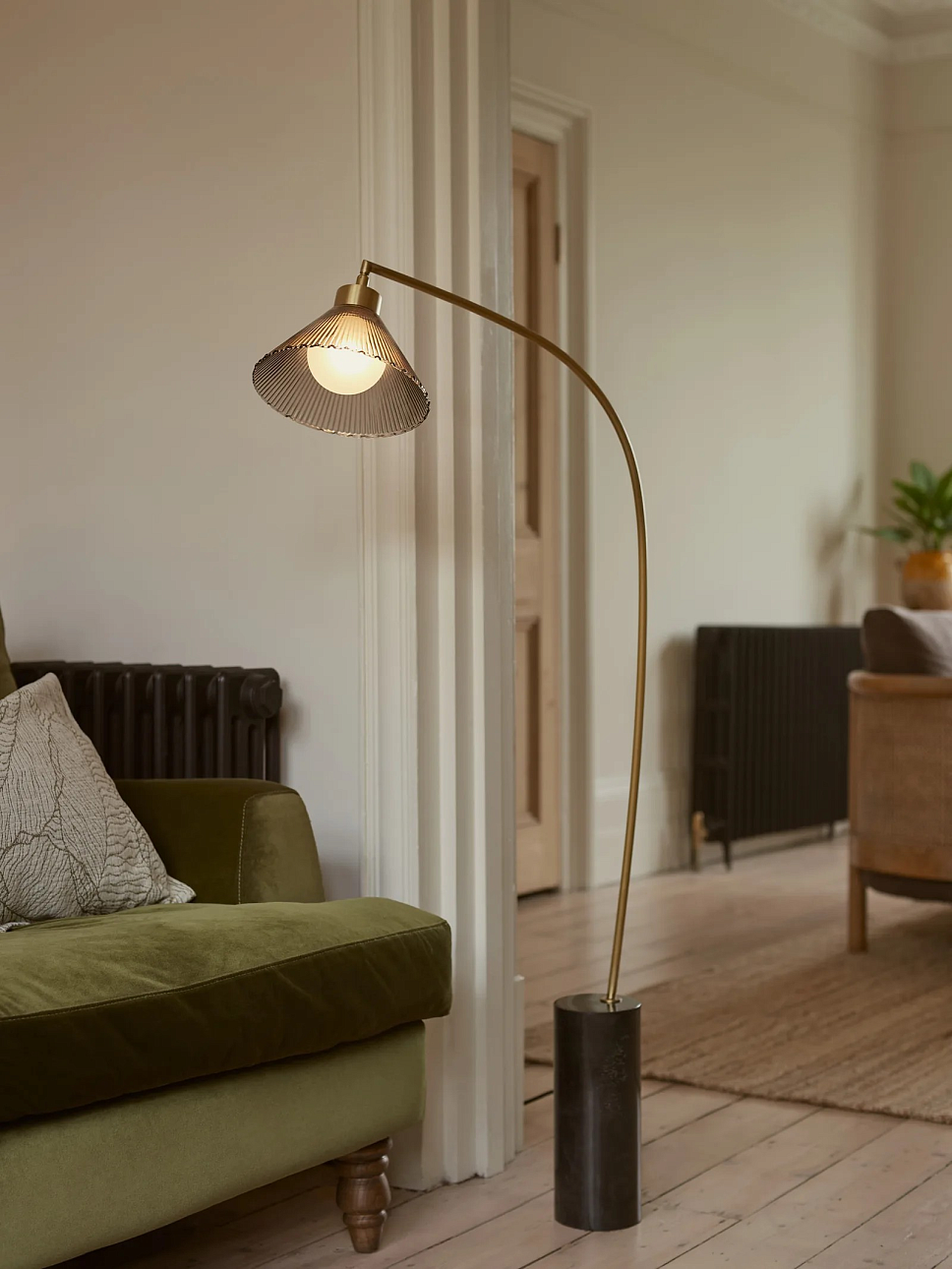 Напольная лампа Daisy от премиального английского бренда Heathfield & Co изготавливается из металла в латунной отделке и мрамора. Абажур выполняется из стекла. Светильник работает от лампочки максимальной мощностью 60 Вт, G9.