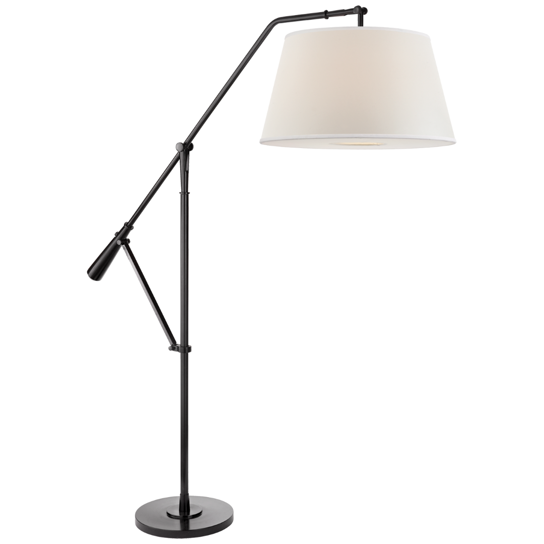 Торшер Nolan от премиального американского бренда Ralph Lauren. Основание выполняется из металла в отделке никель, окрашенный в черный цвет. Абажур сделан из перкаля. Работает от 2 лампочек мощностью 60 Вт. Высота и ширина регулируются. Абажур: 35.6 х 48.3 х 29.2 см.