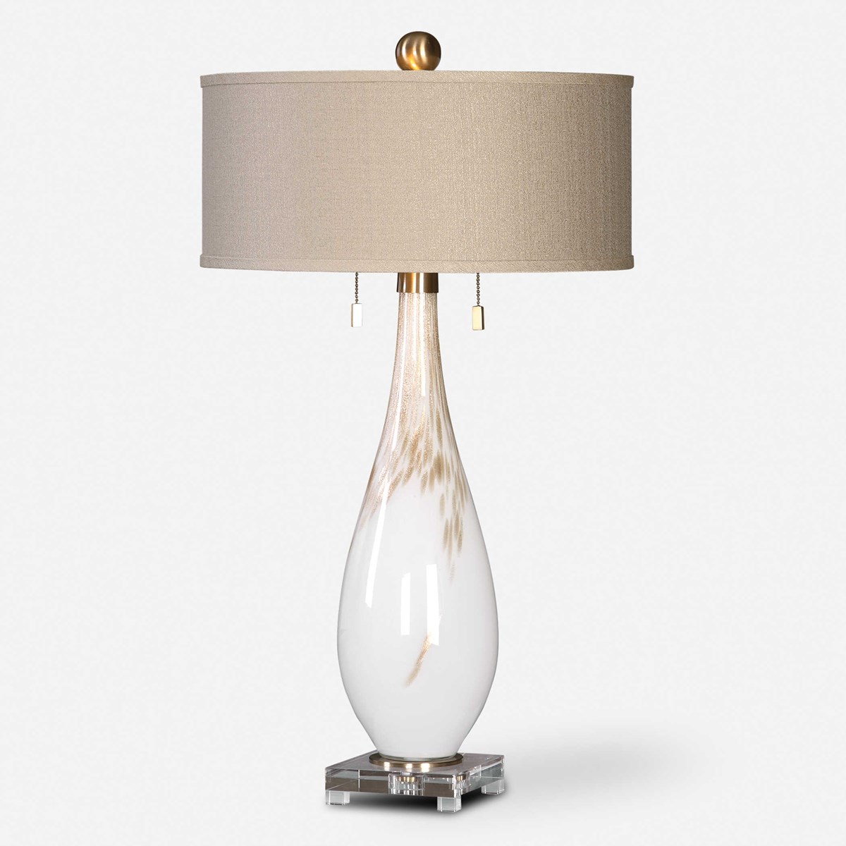 Настольная лампа Cardon от премиального американского бренда Uttermost. Глянцевое белое стекло с металлическими золотисто-бронзовыми оттенками, акцентированное металлическими деталями из полированной латуни и толстой хрустальной ножкой. Круглый абажур в твердом переплете выполнен из льняной ткани серо-бронзового цвета с натуральным ворсом.