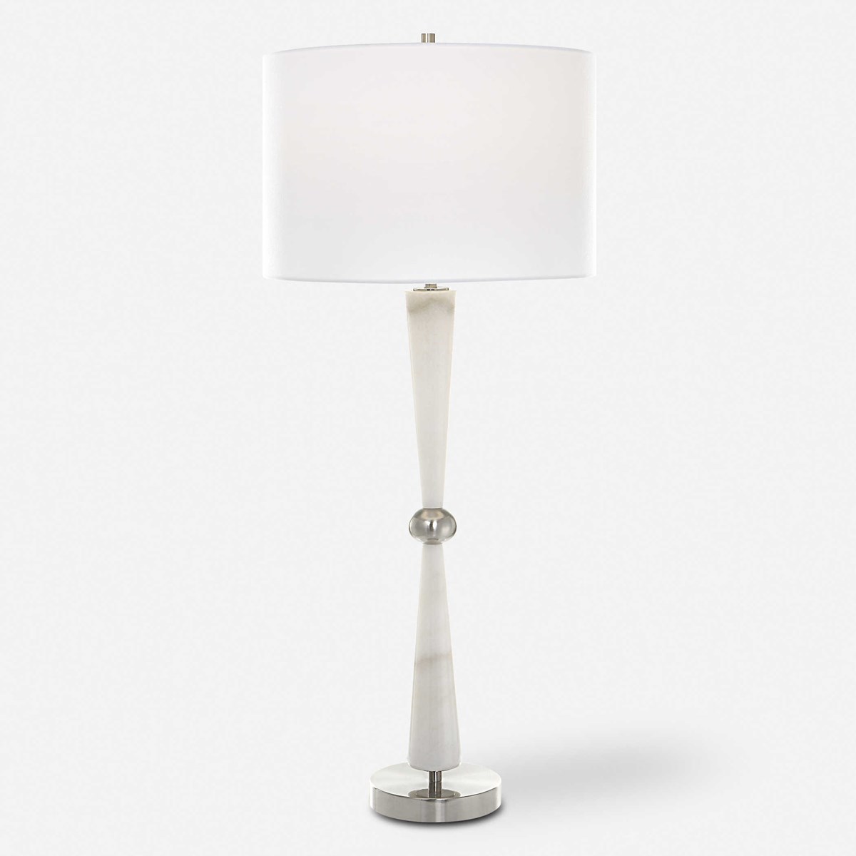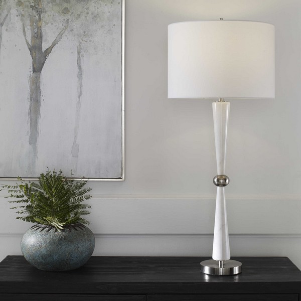 Настольная лампа Hourglass от американского премиального бренда Uttermost. Эта вневременная и изысканная настольная лампа выполнена из белого мрамора с тонкими серыми прожилками, подчеркнутыми металлическими деталями в отделке матовый никель. Завершает это произведение белый абажур.