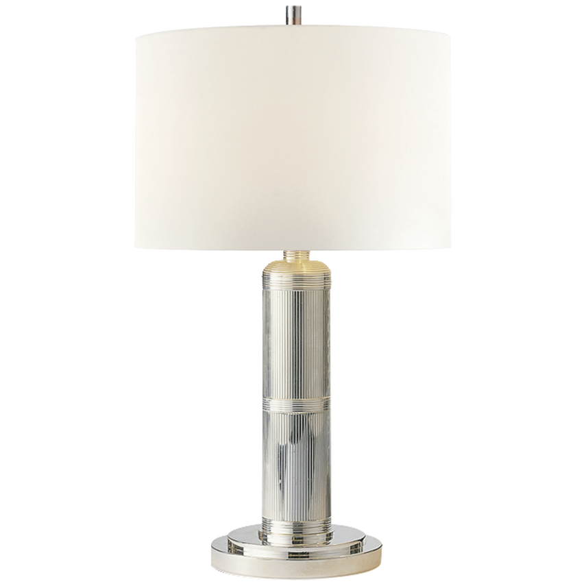 Настольная лампа Longacre от премиального американского бренда Visual Comfort. Абажур выполняется из льна белого цвета. Основание изготавливается из металла в отделке полированный никель. Светильник работает от 2 лампочек максимальной мощностью 40 Вт.