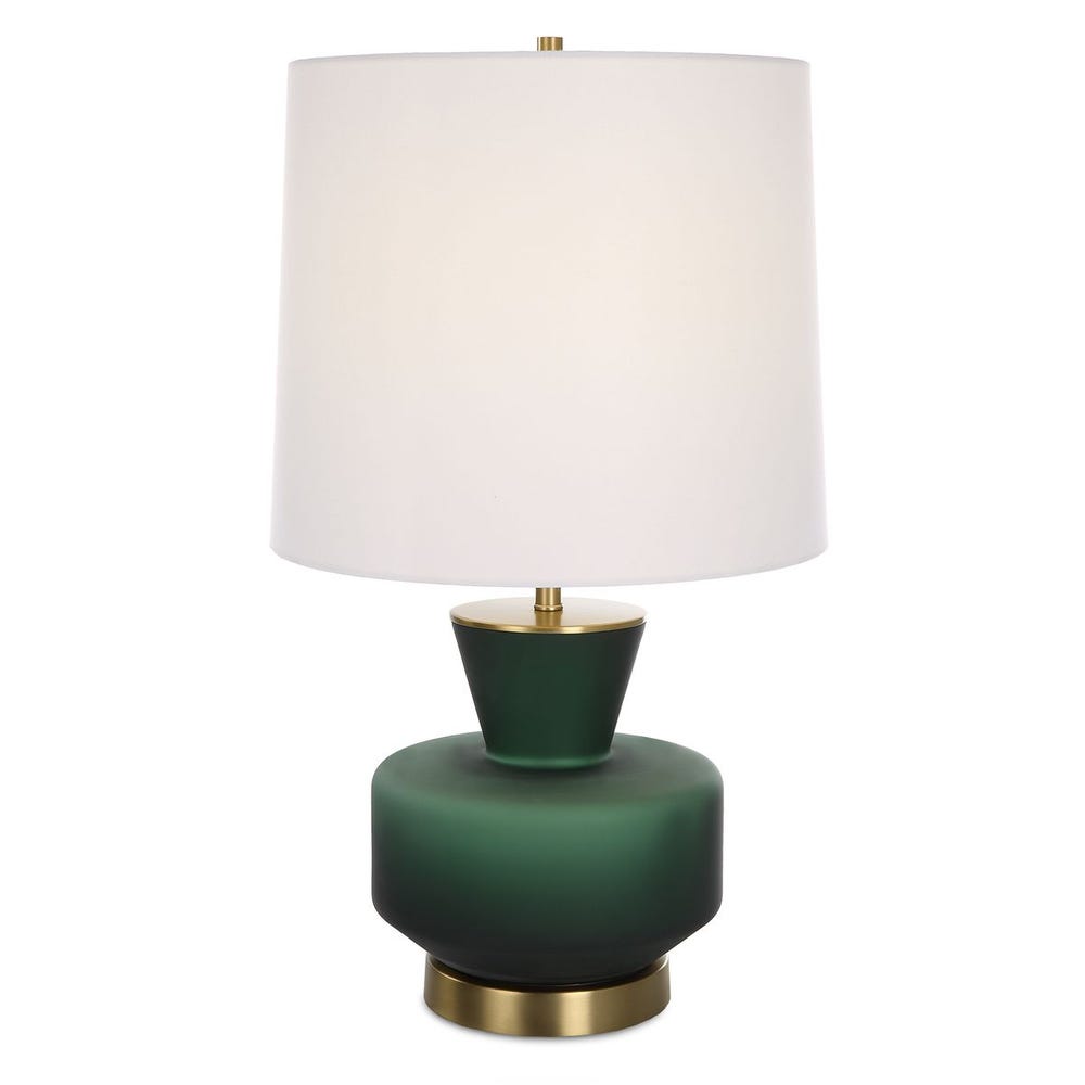 Настольная лампа Trentino от американского премиального бренда Uttermost. Модель имеет уникальное основание из темно-изумрудного стекла с элементами из латуни с эффектом патины. Конусообразный круглый абажур из льняной ткани белого цвета.