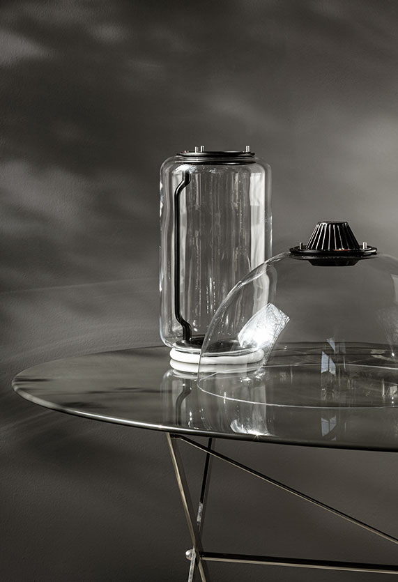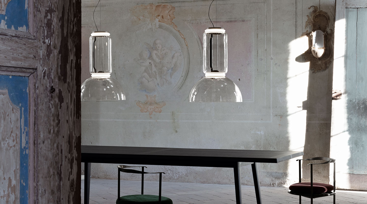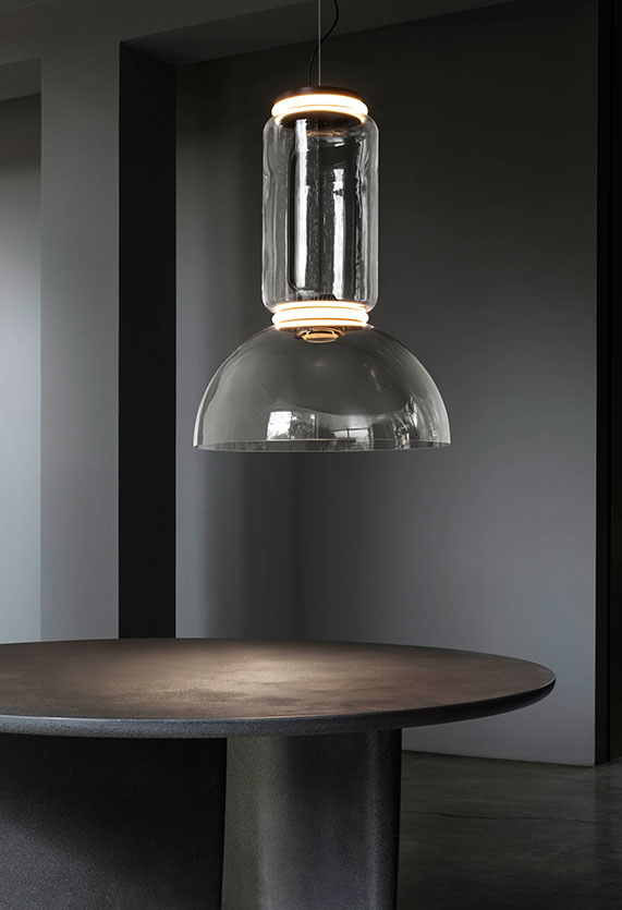 Подвесная люстра Noctambule от премиального итальянского бренда FLOS. Была создана в 2019 году дизайнером Konstantin Grcic. Может быть использована исключительно внутри помещений. В коллекции предлагается в нескольких размерах: в виде сочетания цилиндра и завершающего элемента в форме круглой чаши. Каждый элемент конструкции выполнен вручную из прозрачного стекла. Удерживается люстра кольцом из литого алюминия черного цвета. Наружный диффузор выполнен из опалового силикона в форме кольца. Максимальная длина провода 4 метра. Работает от лампочки с максимальной мощностью 36 Ватт. Может быть подключена к диммеру.