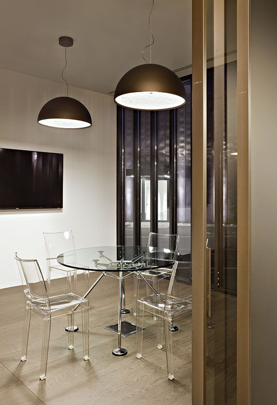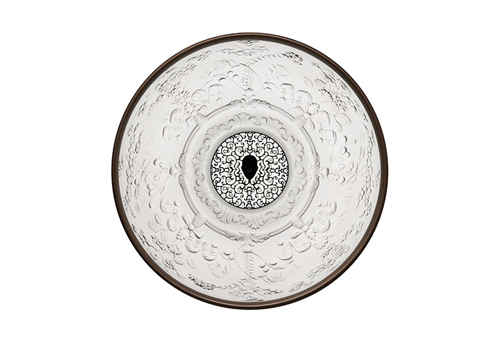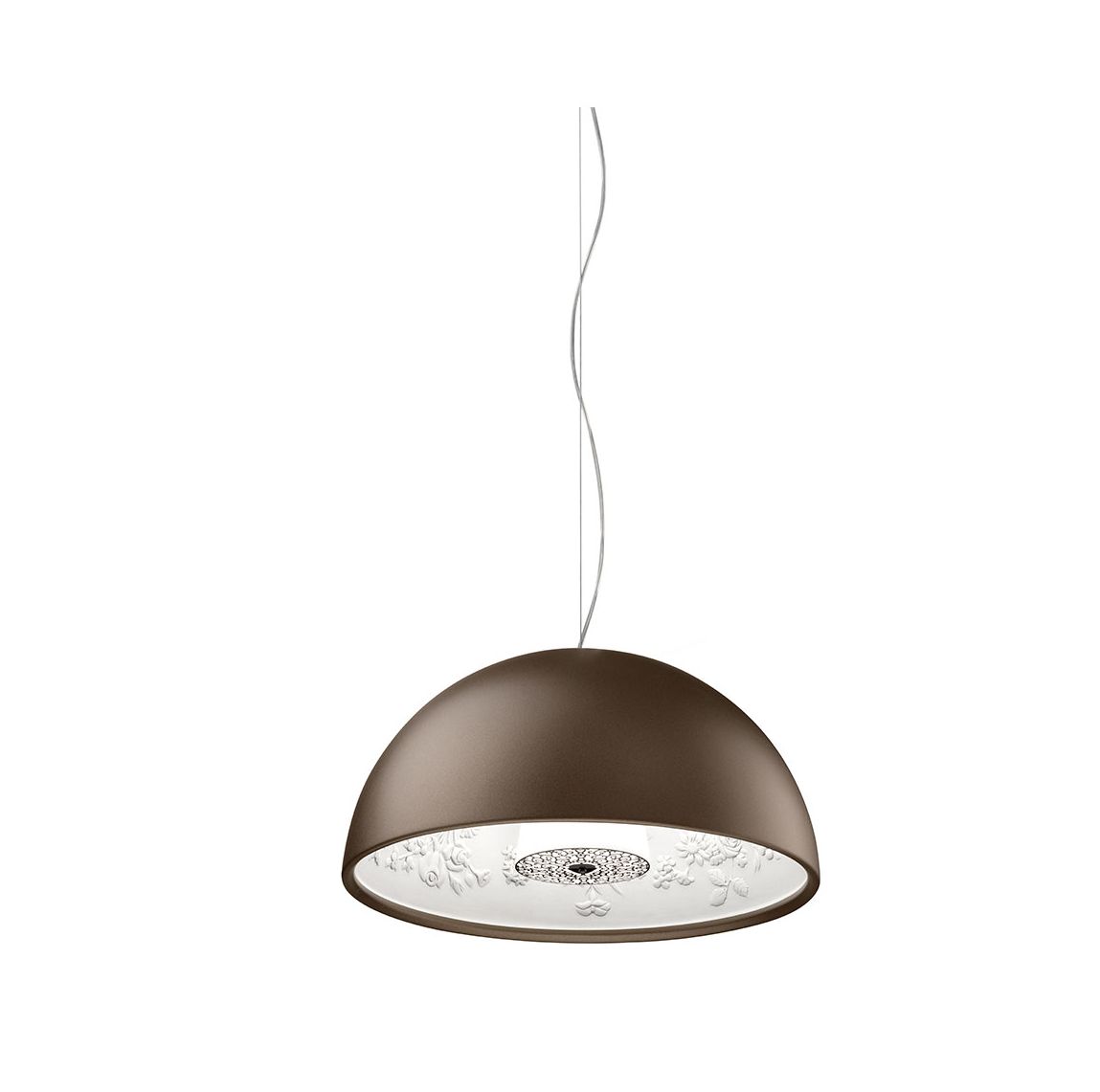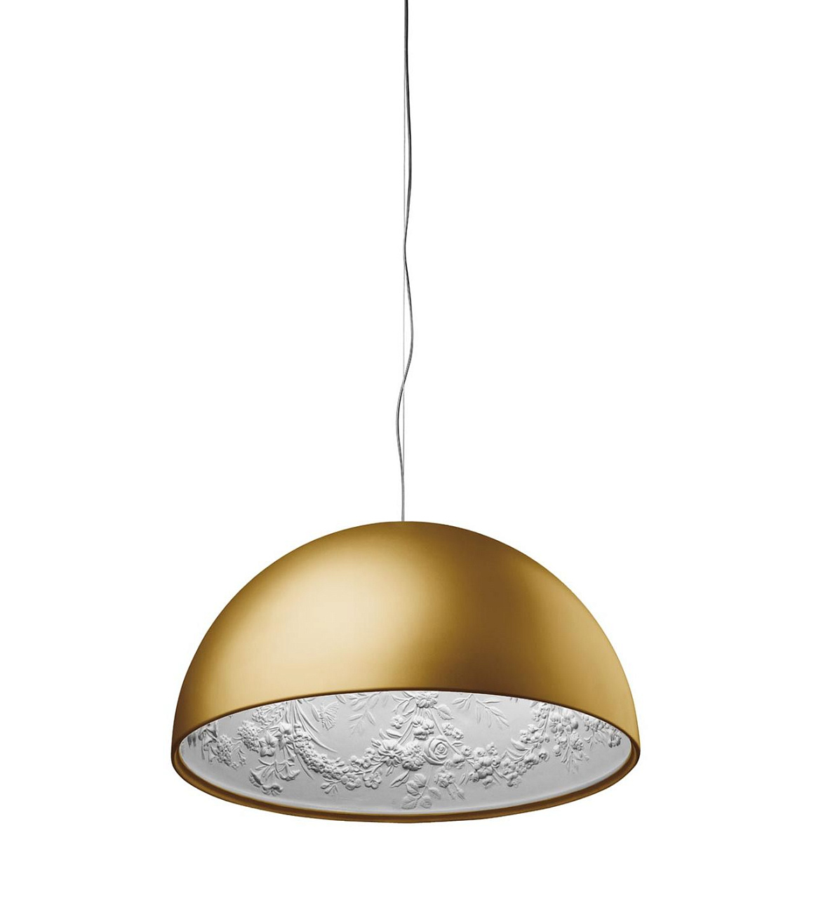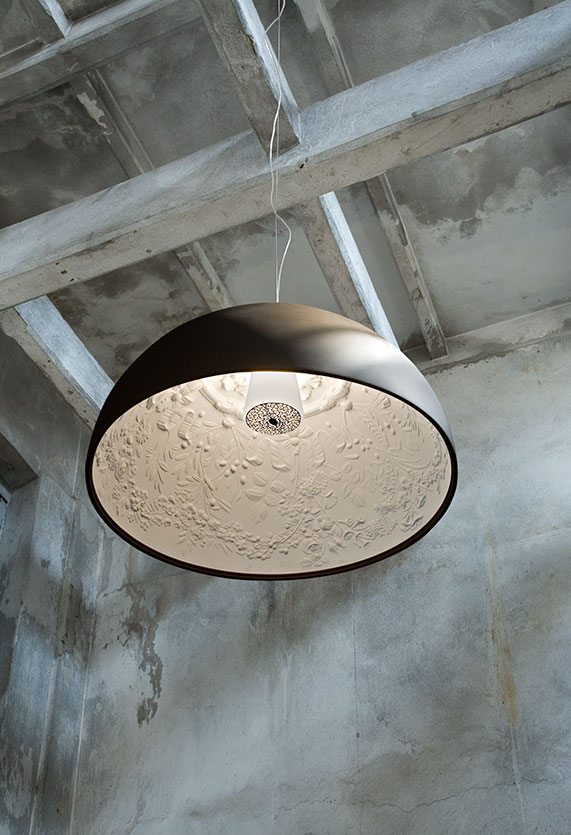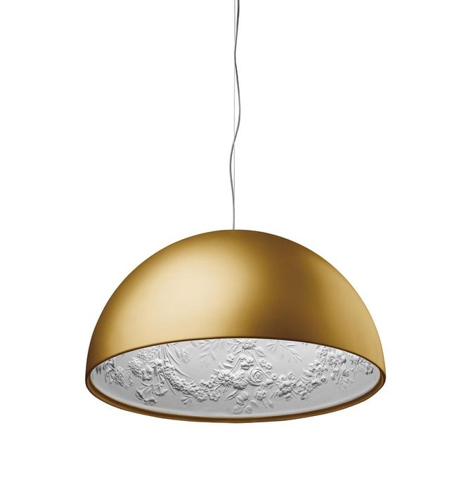 Подвесная люстра Skygarden от премиального итальянского бренда FLOS. Была создана в 2007 году дизайнерами студии Marcel Wanders studio. Может быть использована исключительно внутри помещений. Предлагается в трех вариантах, отличающихся диаметром и высотой абажура. Чашеобразная форма гипсового материала снаружи окрашена в один из оттенков: черный, золотой, коричневато-ржавый, глянцевый черный, глянцевый белый. Внутри поверхность диффузора окрашена в белый цвет. Удерживается алюминиевым креплением к проводу длиной 2,7 метра. Работает от лампочки с максимальной мощностью 230 Ватт.