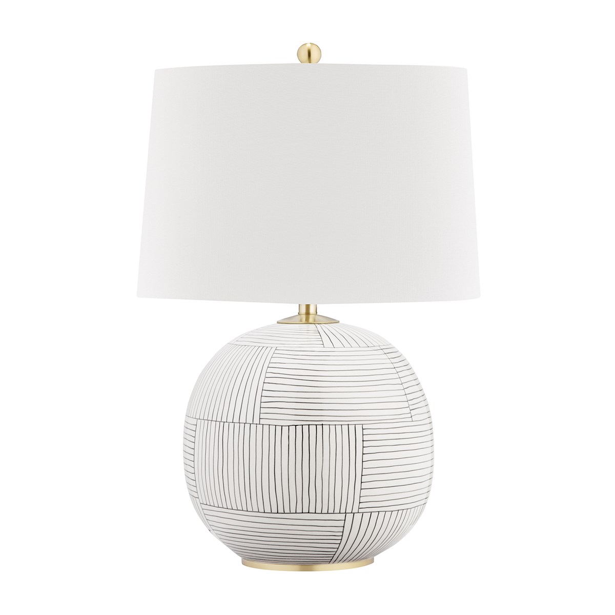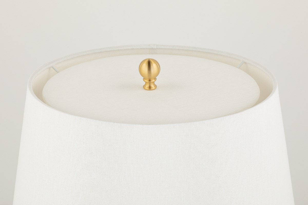 Настольная лампа Laurel от премиального американского бренда Hudson Valley. Основание и металлические элементы представлены в цвете состаренной латуни. Круглая ножка доступна в двух вариантах: белого цвета с черными линиями или с линиями-мазками голубого цвета. Абажур выполняется из белого бельгийского льна. Работает от 1 лампочки мощностью 75 Ватт, с цоколем E26.